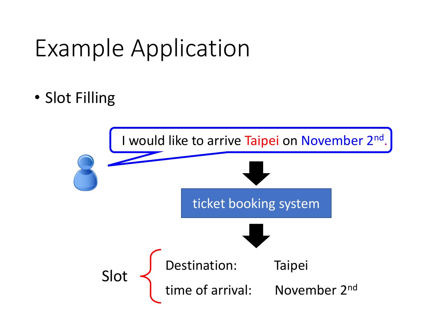 2 .Example Application • Slot Filling I would like to arrive Taipei on November 2nd. ticket booking system Destination: Taipei Slot time of arrival: November 2nd