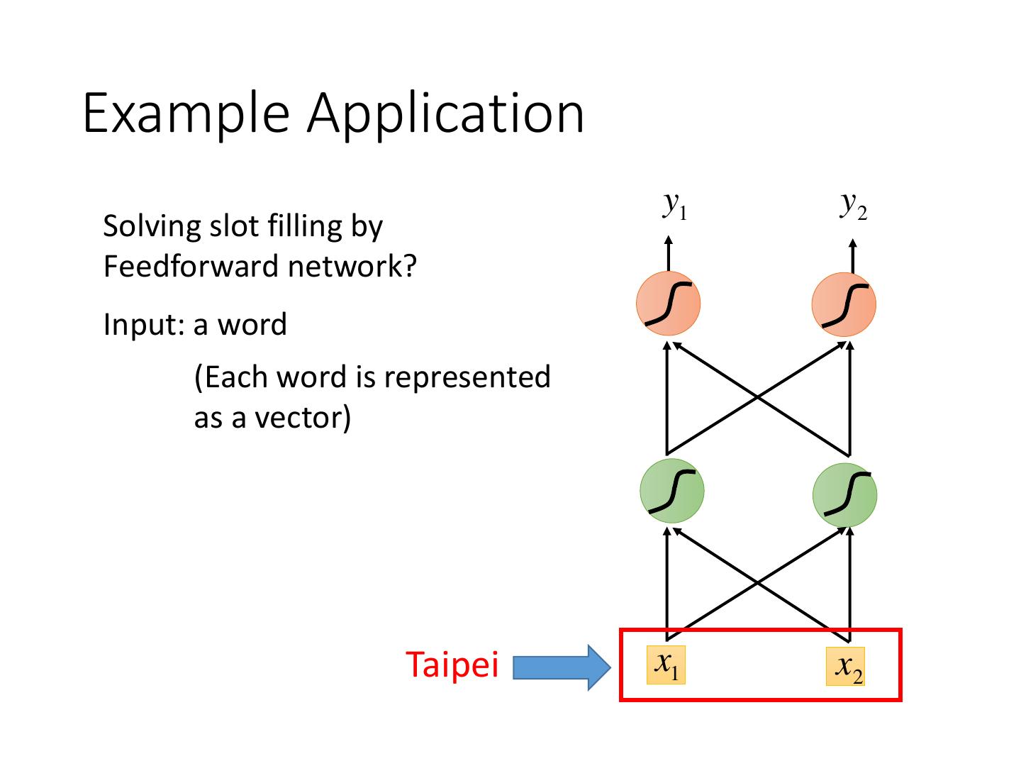 3 .Example Application y1 y2 Solving slot filling by Feedforward network? Input: a word (Each word is represented as a vector) Taipei x1 x2
