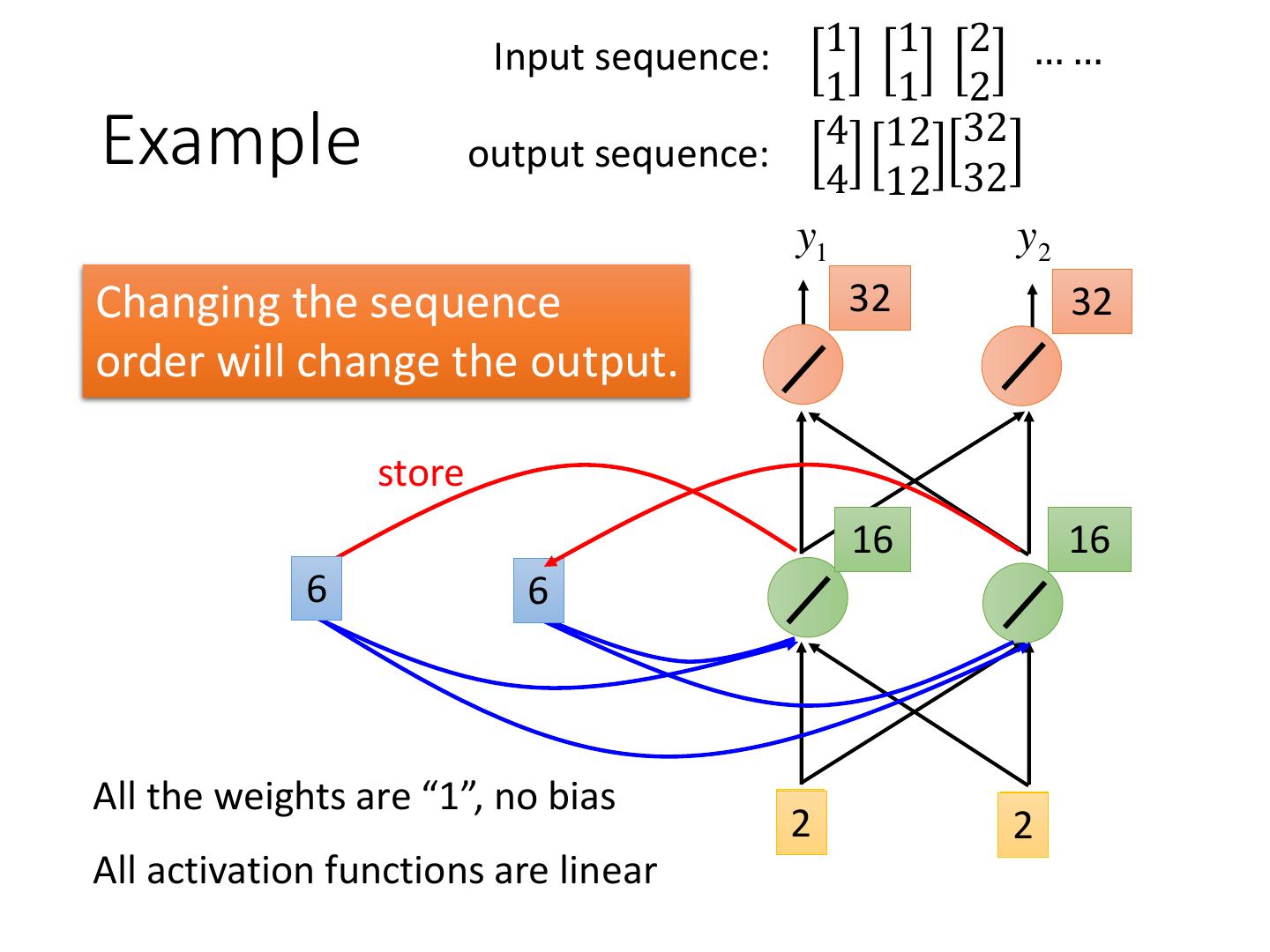 11 . Input sequence: 1 1 2 …… 1 1 2 Example 4 12 32 output sequence: 4 12 32 y1 y2 Changing the sequence 32 32 order will change the output. store 16 16 a61 a62 All the weights are “1”, no bias x21 x22 All activation functions are linear