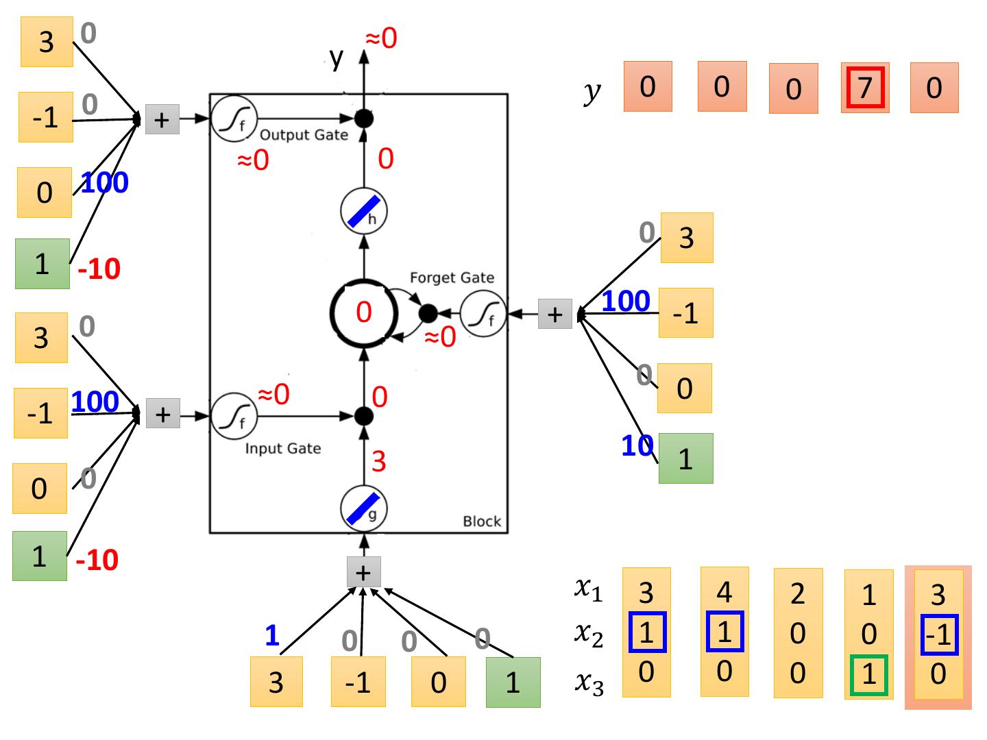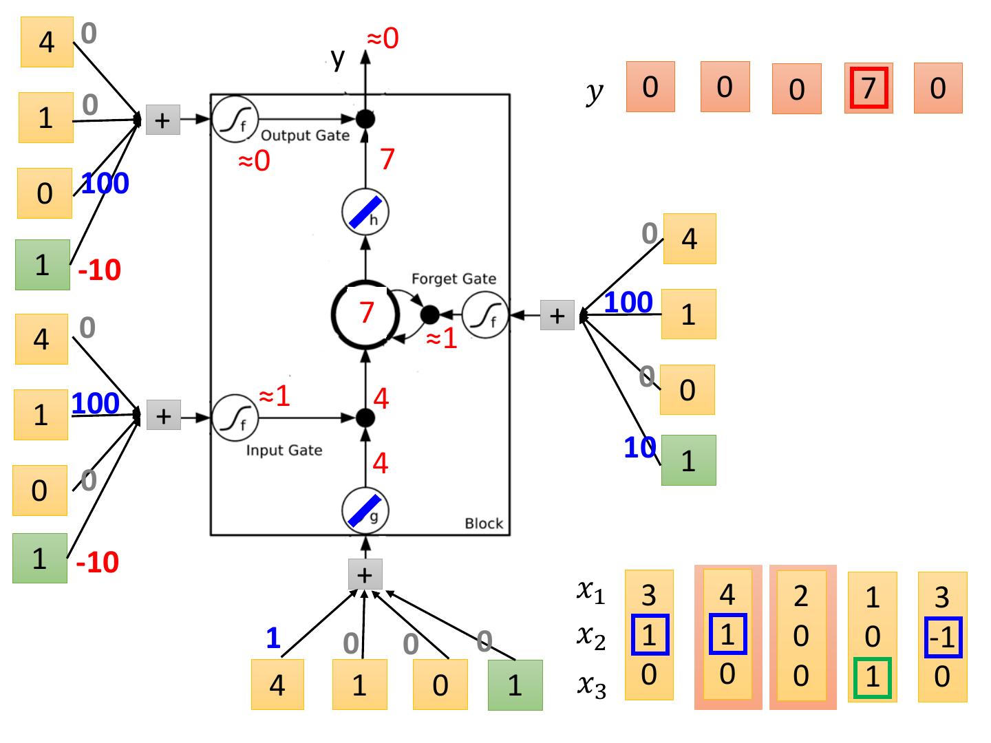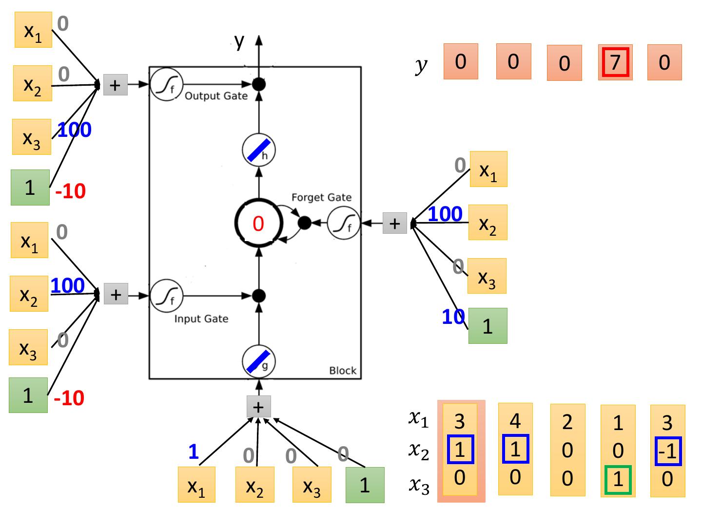 19 .LSTM - Example 0 0 3 3 7 7 7 0 6 𝑥1 1 3 2 4 2 1 3 6 1 𝑥2 0 1 0 1 0 0 -1 1 0 𝑥3 0 0 0 0 0 1 0 0 1 𝑦 0 0 0 0 0 7 0 0 6 When x2 = 1, add the numbers of x1 into the memory When x2 = -1, reset the memory When x3 = 1, output the number in the memory.