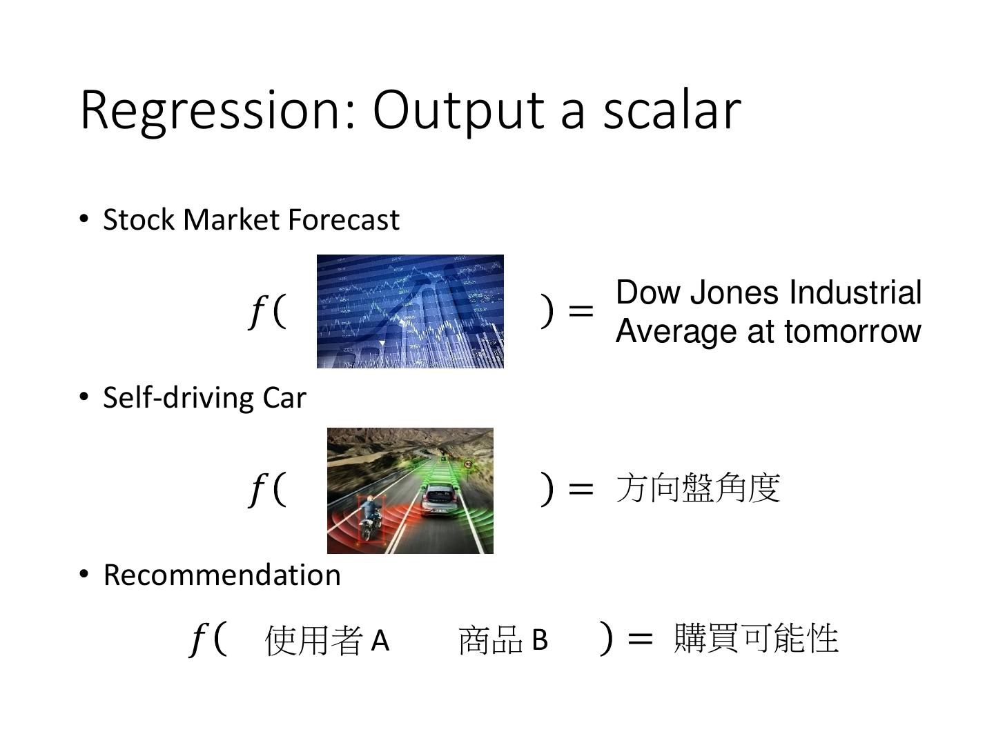 2 .Regression: Output a scalar • Stock Market Forecast 𝑓 = Dow Jones Industrial Average at tomorrow • Self-driving Car 𝑓 = 方向盤角度 • Recommendation 𝑓 使用者 A 商品 B = 購買可能性