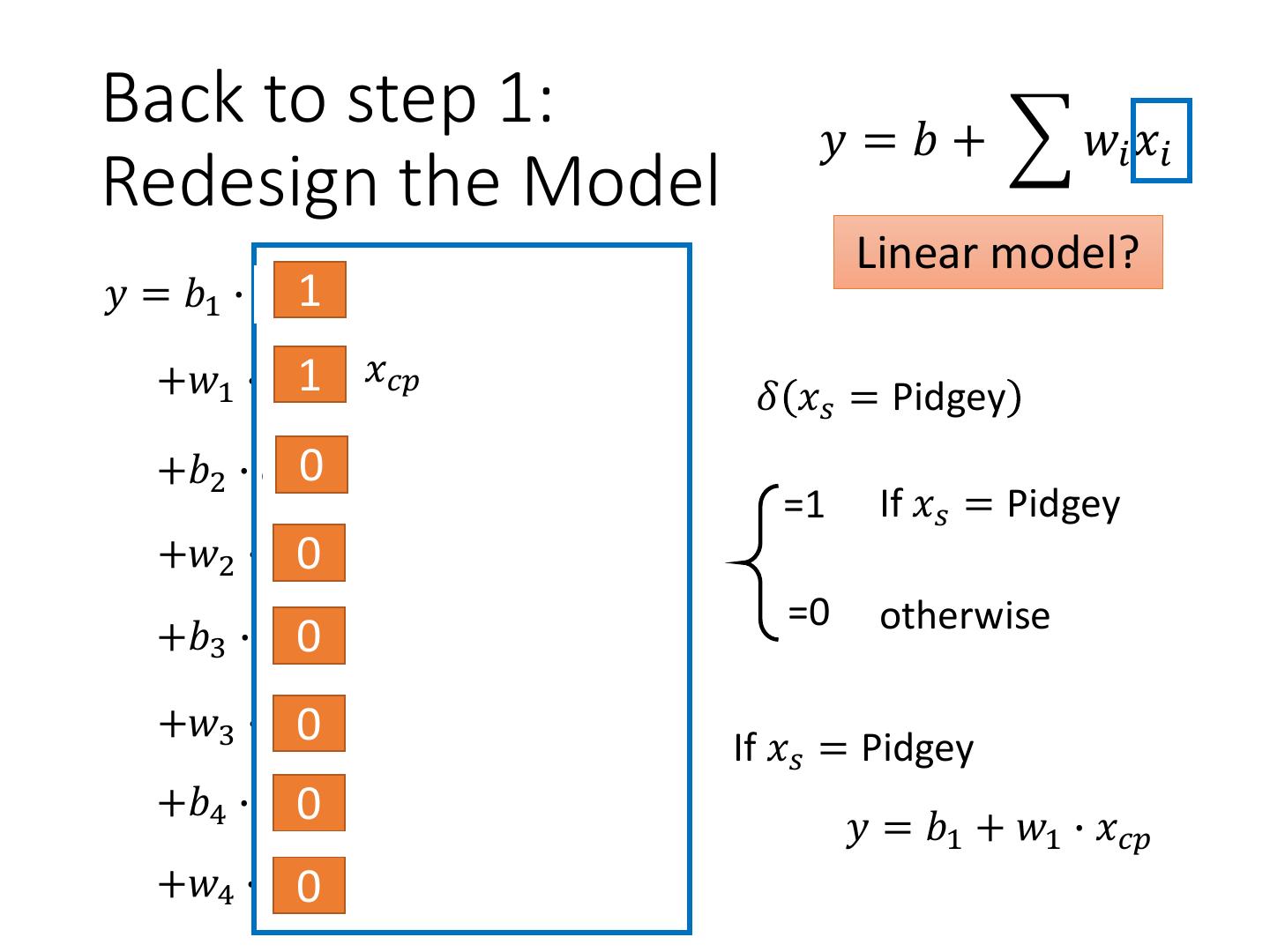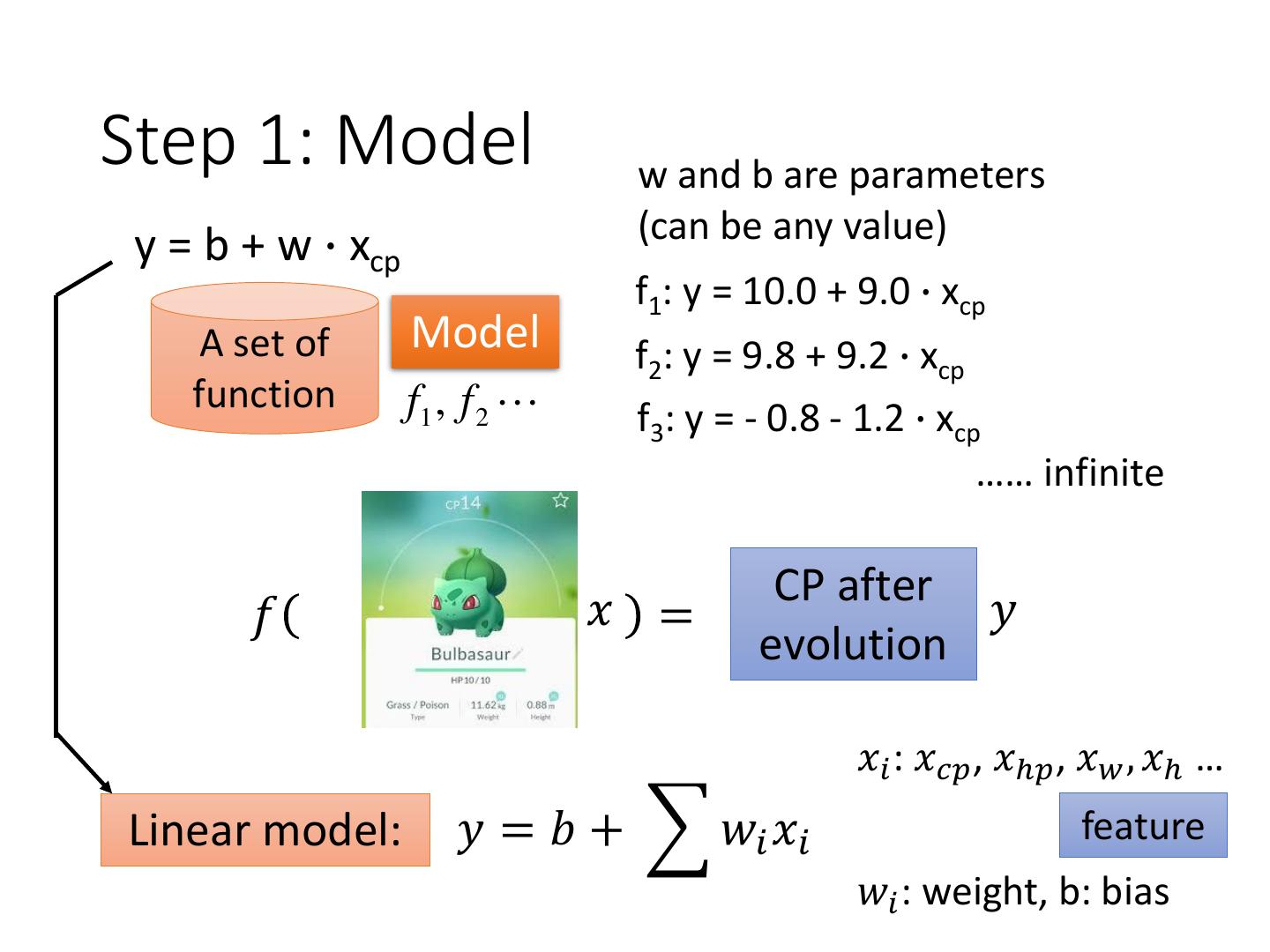4 .Step 1: Model w and b are parameters y = b + w ∙ xcp (can be any value) f1: y = 10.0 + 9.0 ∙ xcp A set of Model f2: y = 9.8 + 9.2 ∙ xcp function f1 , f 2 f3: y = - 0.8 - 1.2 ∙ xcp …… infinite CP after 𝑓 𝑥 = 𝑦 evolution 𝑥𝑖 : 𝑥𝑐𝑝 , 𝑥ℎ𝑝 , 𝑥𝑤 , 𝑥ℎ … Linear model: 𝑦 = 𝑏 + 𝑤𝑖 𝑥𝑖 feature 𝑤𝑖 : weight, b: bias