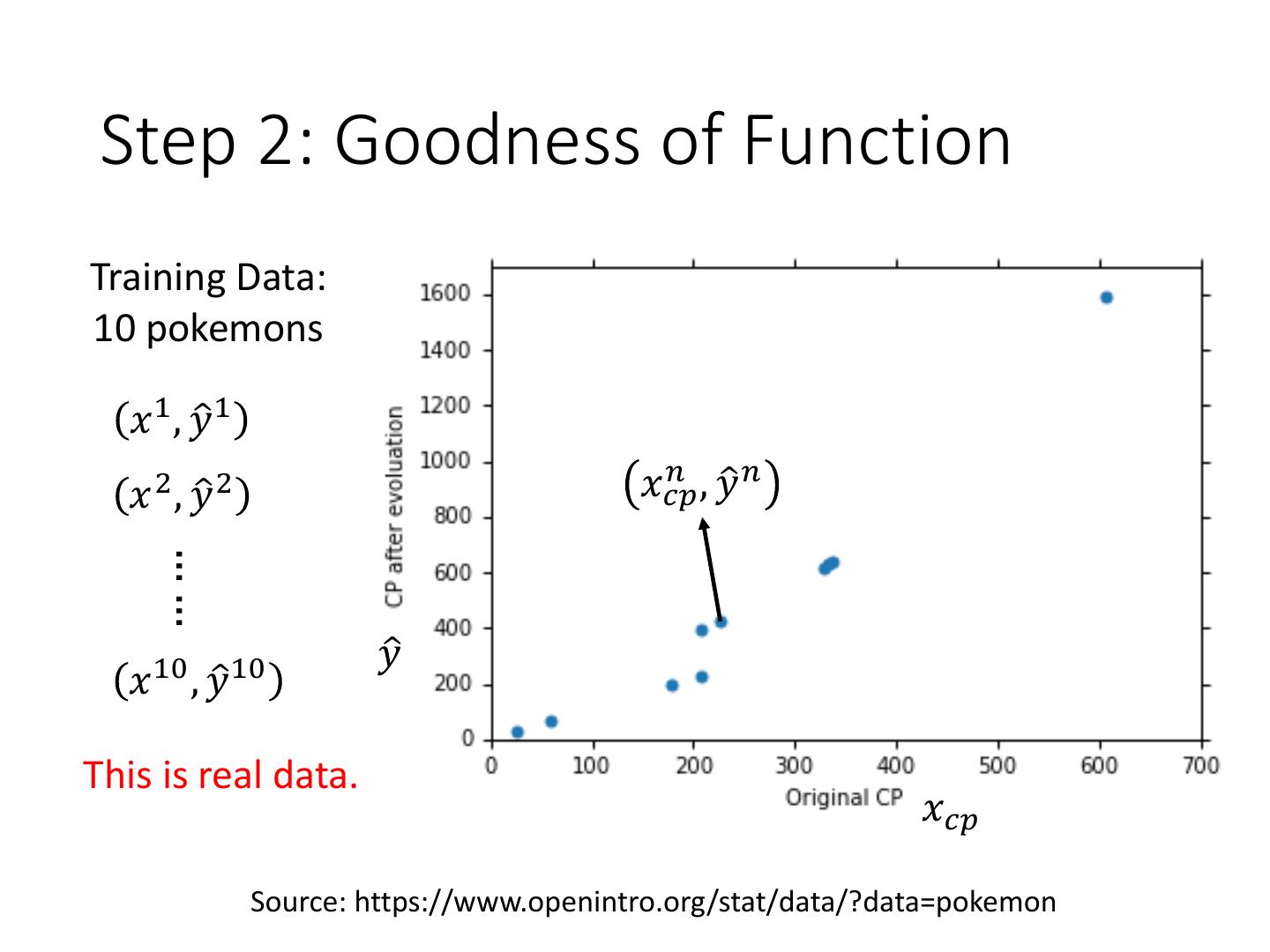 6 . Step 2: Goodness of Function Training Data: 10 pokemons 𝑥 1 , 𝑦ො 1 𝑛 ,𝑦 𝑥𝑐𝑝 ො𝑛 𝑥 2 , 𝑦ො 2 …… 𝑦ො 𝑥 10 , 𝑦ො 10 This is real data. 𝑥𝑐𝑝 Source: https://www.openintro.org/stat/data/?data=pokemon