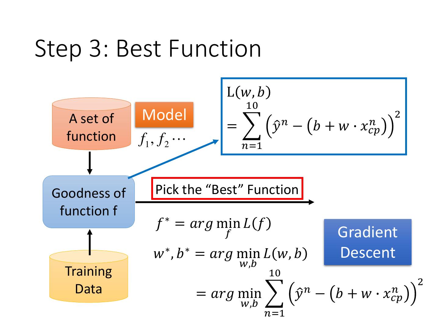 9 .Step 3: Best Function L 𝑤, 𝑏 10 A set of Model 2 = 𝑦ො 𝑛 − 𝑏+𝑤∙ 𝑛 𝑥𝑐𝑝 function f1 , f 2 𝑛=1 Goodness of Pick the “Best” Function function f 𝑓 ∗ = 𝑎𝑟𝑔 min 𝐿 𝑓 𝑓 Gradient 𝑤 ∗ , 𝑏 ∗ = 𝑎𝑟𝑔 min 𝐿 𝑤, 𝑏 Descent 𝑤,𝑏 Training 10 2 Data = 𝑎𝑟𝑔 min 𝑦ො 𝑛 − 𝑏+𝑤∙ 𝑛 𝑥𝑐𝑝 𝑤,𝑏 𝑛=1