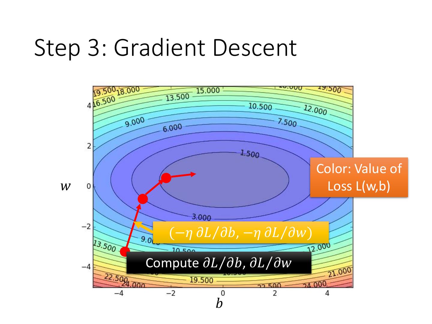 14 .Step 3: Gradient Descent Color: Value of 𝑤 Loss L(w,b) (−𝜂 𝜕𝐿Τ𝜕𝑏, −𝜂 𝜕𝐿Τ𝜕𝑤) Compute 𝜕𝐿Τ𝜕𝑏, 𝜕𝐿Τ𝜕𝑤 𝑏