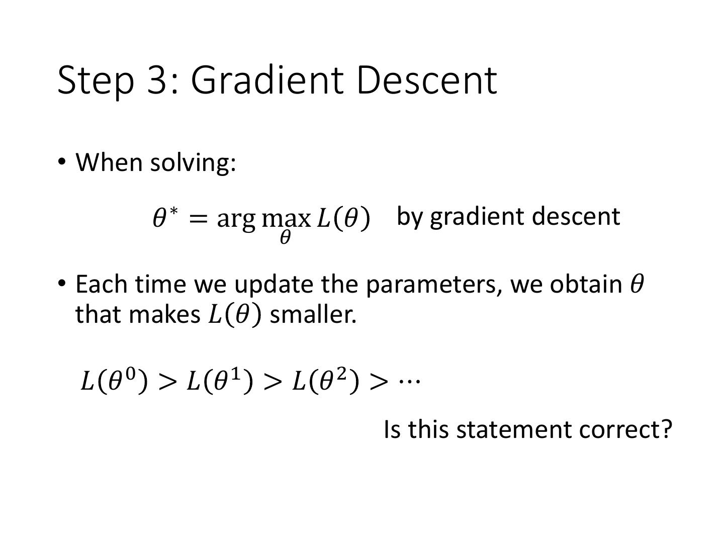 15 .Step 3: Gradient Descent • When solving: 𝜃 ∗ = arg max 𝐿 𝜃 by gradient descent 𝜃 • Each time we update the parameters, we obtain 𝜃 that makes 𝐿 𝜃 smaller. 𝐿 𝜃 0 > 𝐿 𝜃1 > 𝐿 𝜃 2 > ⋯ Is this statement correct?