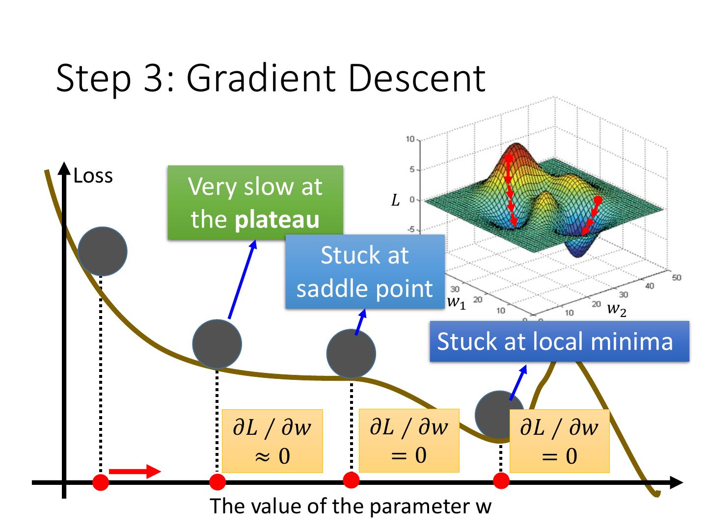 16 .Step 3: Gradient Descent Loss Very slow at 𝐿 the plateau Stuck at saddle point 𝑤1 𝑤2 Stuck at local minima 𝜕𝐿 ∕ 𝜕𝑤 𝜕𝐿 ∕ 𝜕𝑤 𝜕𝐿 ∕ 𝜕𝑤 ≈0 =0 =0 The value of the parameter w