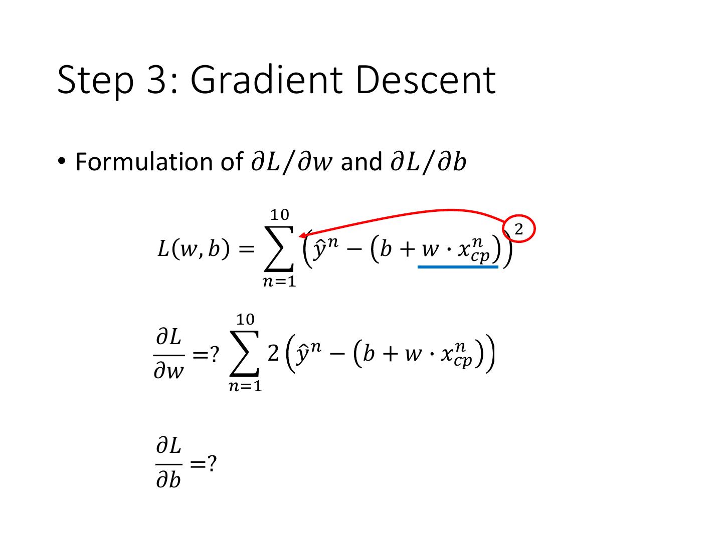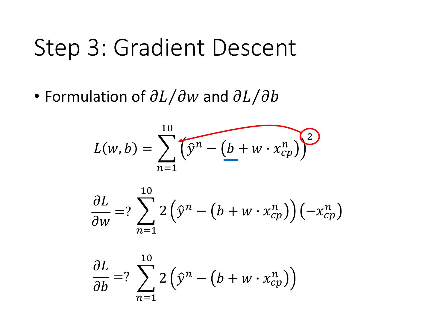18 .Step 3: Gradient Descent • Formulation of 𝜕𝐿Τ𝜕𝑤 and 𝜕𝐿Τ𝜕𝑏 10 2 𝑛 𝑛 𝐿 𝑤, 𝑏 = 𝑦ො − 𝑏 + 𝑤 ∙ 𝑥𝑐𝑝 𝑛=1 10 𝜕𝐿 =? 2 𝑦ො 𝑛 − 𝑏 + 𝑤 ∙ 𝑥𝑐𝑝 𝑛 𝑛 −𝑥𝑐𝑝 𝜕𝑤 𝑛=1 10 𝜕𝐿 =? 2 𝑦ො 𝑛 − 𝑏 + 𝑤 ∙ 𝑥𝑐𝑝 𝑛 −1 𝜕𝑏 𝑛=1