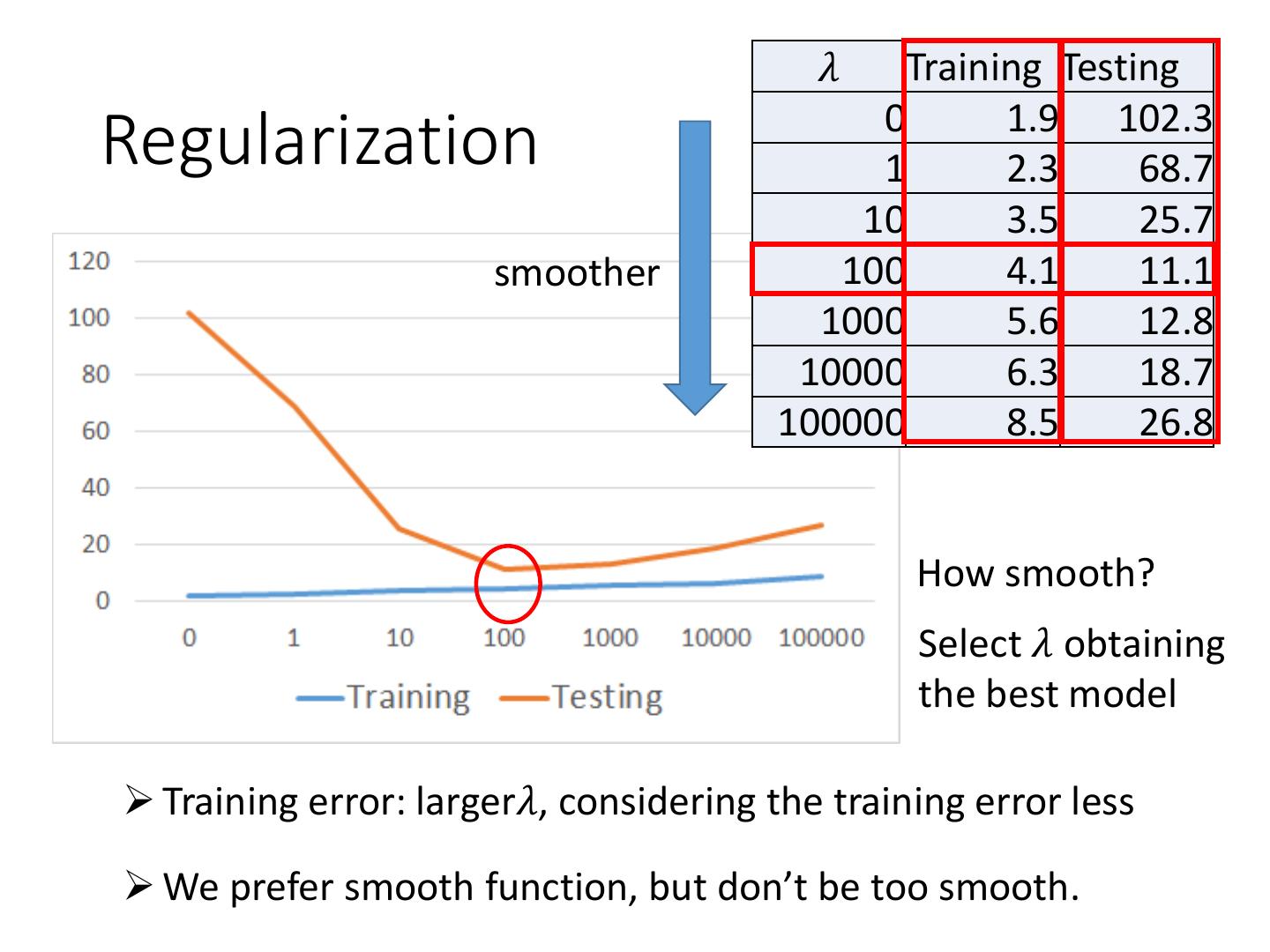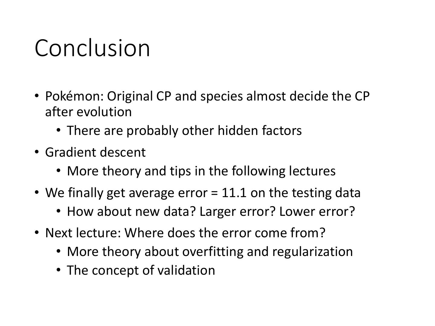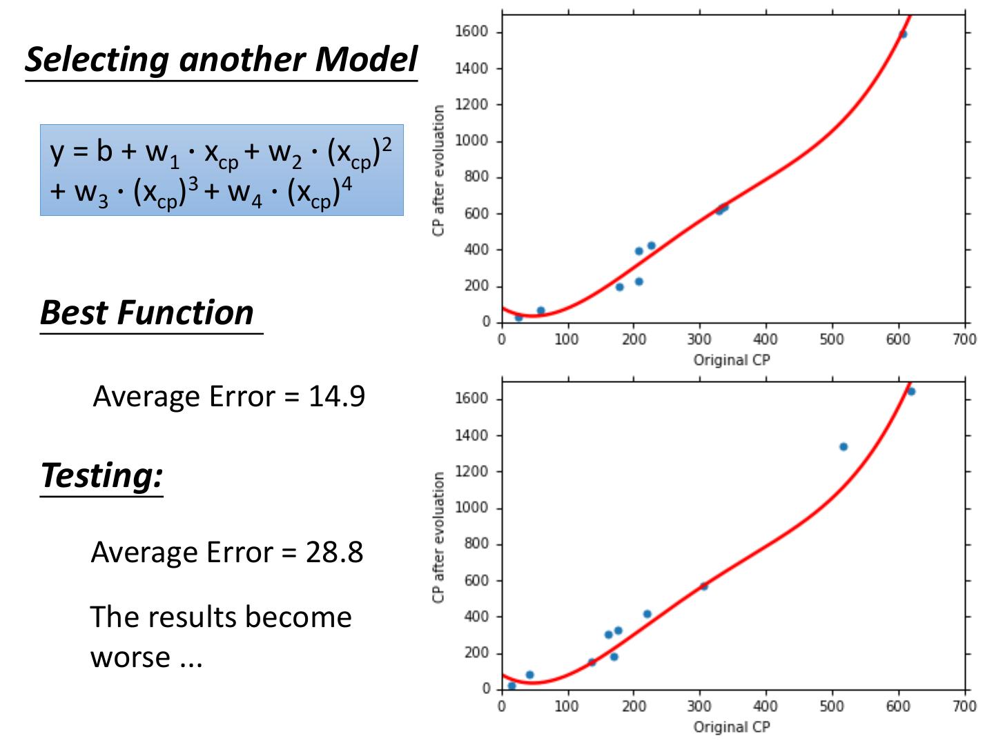 22 .Selecting another Model y = b + w1 ∙ xcp + w2 ∙ (xcp)2 Best Function b = -10.3 w1 = 1.0, w2 = 2.7 x 10-3 Average Error = 15.4 Testing: Average Error = 18.4 Better! Could it be even better?