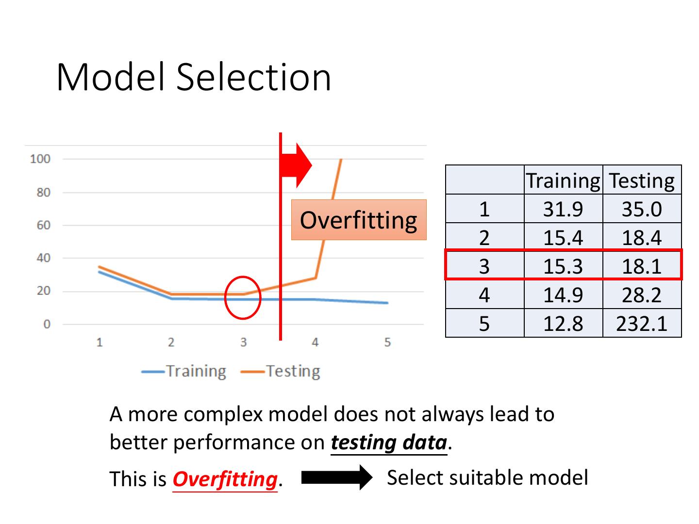 27 .Model Selection Training Testing 1 31.9 35.0 Overfitting 2 15.4 18.4 3 15.3 18.1 4 14.9 28.2 5 12.8 232.1 A more complex model does not always lead to better performance on testing data. This is Overfitting. Select suitable model
