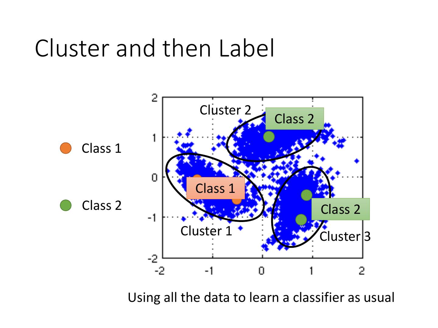 22 .Cluster and then Label Cluster 2 Class 2 Class 1 Class 1 Class 2 Class 2 Cluster 1 Cluster 3 Using all the data to learn a classifier as usual