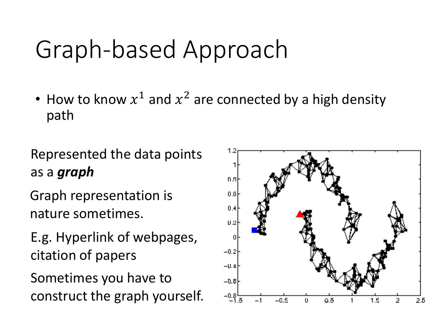 23 .Graph-based Approach • How to know 𝑥 1 and 𝑥 2 are connected by a high density path Represented the data points as a graph Graph representation is nature sometimes. E.g. Hyperlink of webpages, citation of papers Sometimes you have to construct the graph yourself.