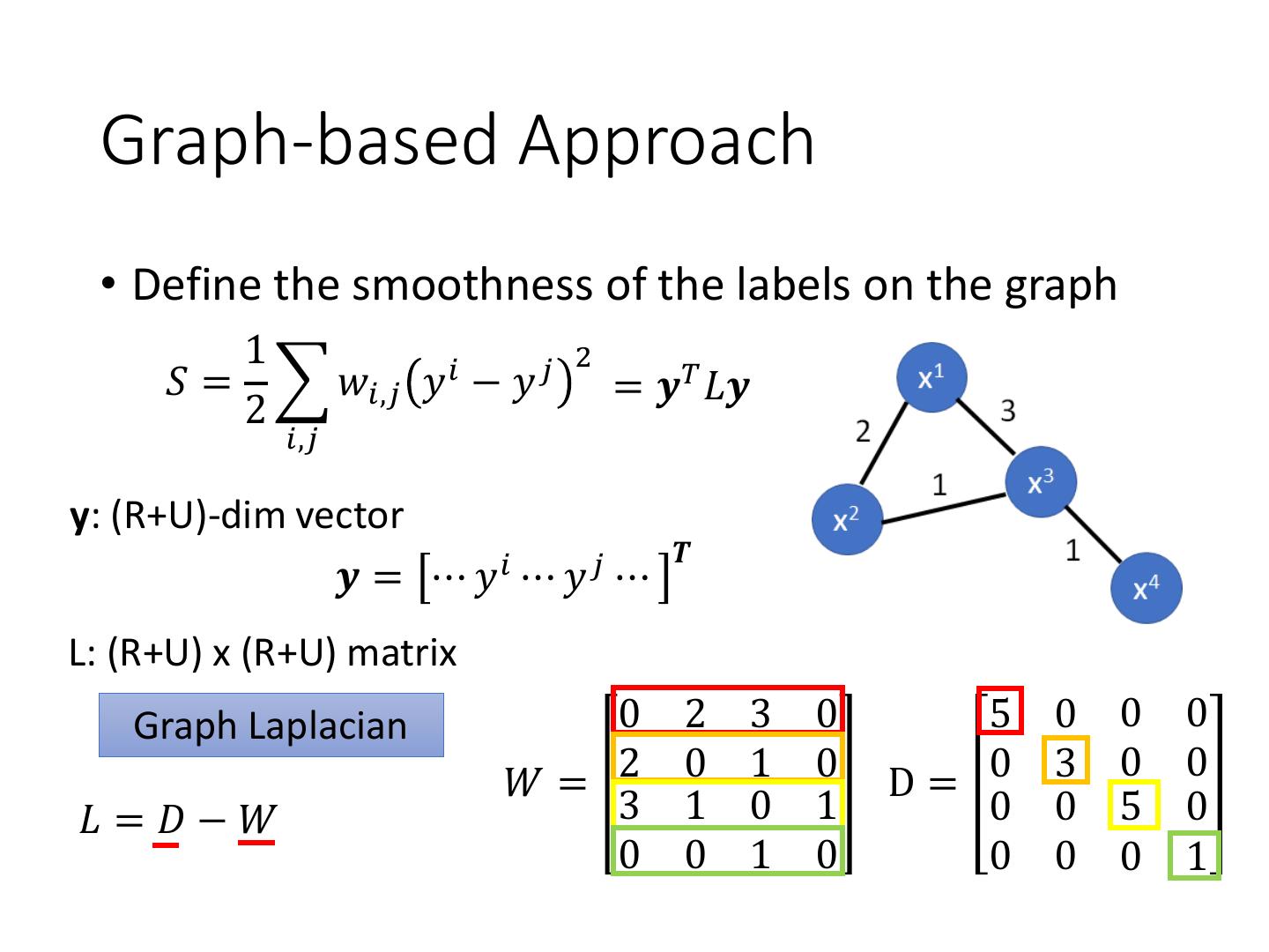 27 . Graph-based Approach • Define the smoothness of the labels on the graph 1 2 𝑆 = 𝑤𝑖,𝑗 𝑦 𝑖 − 𝑦 𝑗 = 𝒚𝑇 𝐿𝒚 2 𝑖,𝑗 y: (R+U)-dim vector 𝑻 𝒚 = ⋯ 𝑦𝑖 ⋯ 𝑦 𝑗 ⋯ L: (R+U) x (R+U) matrix Graph Laplacian 0 2 3 0 5 0 0 0 𝑊= 2 0 1 0 D= 0 3 0 0 𝐿 =𝐷−𝑊 3 1 0 1 0 0 5 0 0 0 1 0 0 0 0 1