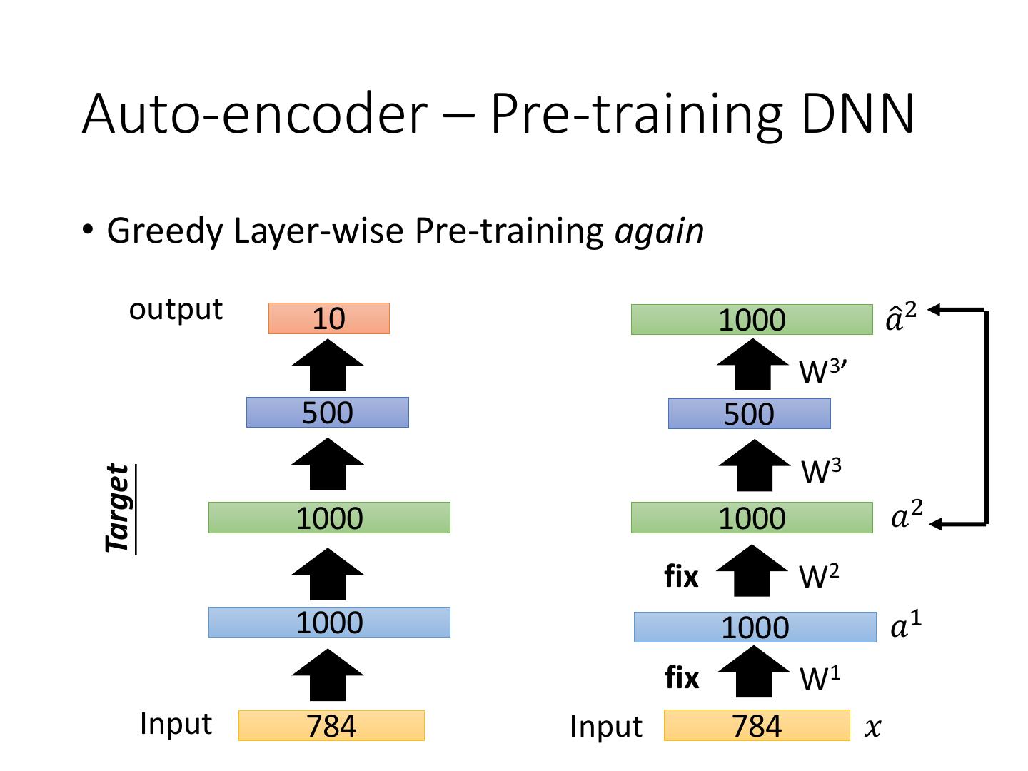 18 .Auto-encoder – Pre-training DNN • Greedy Layer-wise Pre-training again output 10 500 Target 1000 784 𝑥ො W1’ 1000 1000 W1 Input 784 Input 784 𝑥