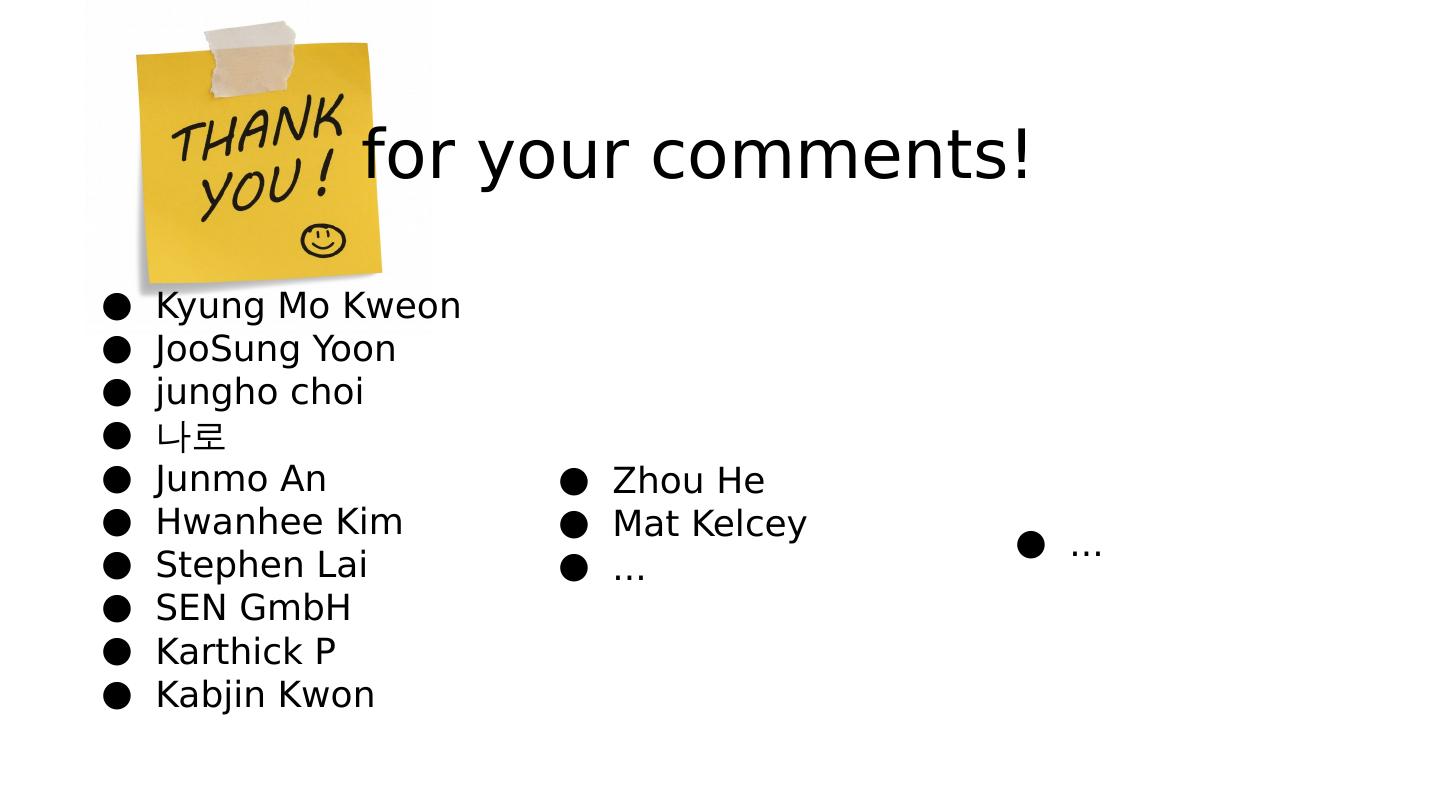 15 .for your comments! Kyung Mo Kweon JooSung Yoon jungho choi 나로 Junmo An Hwanhee Kim Stephen Lai SEN GmbH Karthick P Kabjin Kwon Zhou He Mat Kelcey ... ...