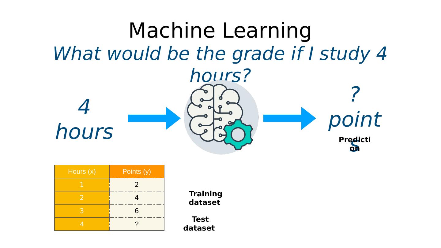 25 .Machine Learning What would be the grade if I study 4 hours? ? points Training dataset Prediction 4 hours Hours (x) Points (y) 1 2 2 4 3 6 4 ? Test dataset