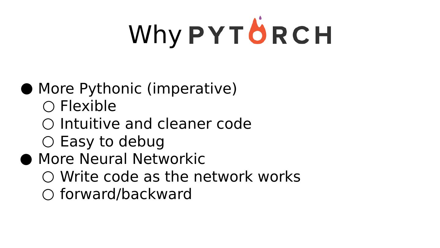 17 .More Pythonic (imperative) Flexible Intuitive and cleaner code Easy to debug More Neural Networkic Write code as the network works forward/backward Why