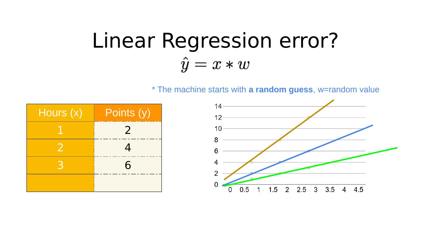 13 .Hours (x) Points (y) 1 2 2 4 3 6 Linear Regression error? * The machine starts with a random guess , w=random value