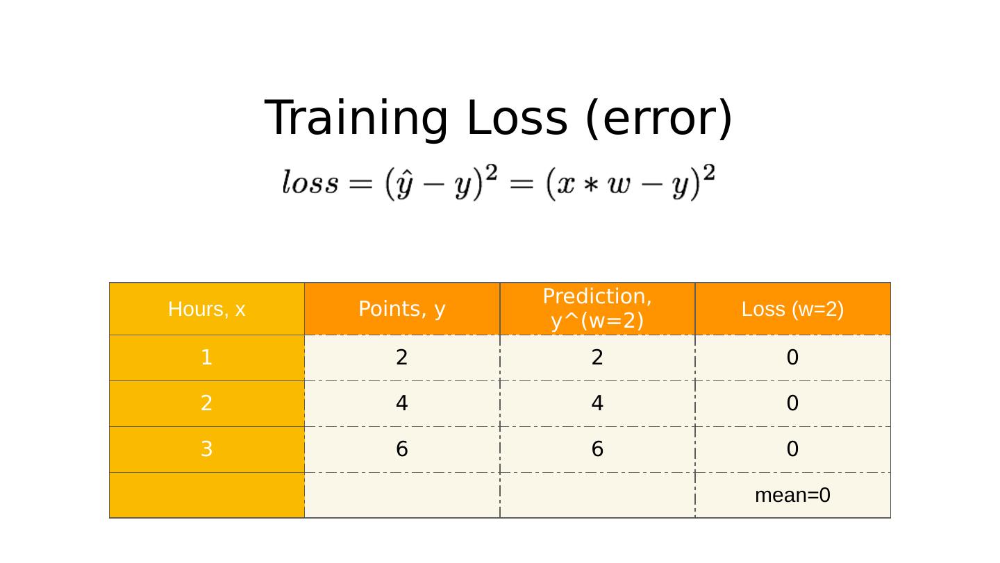 15 .Training Loss (error) Hours, x Points, y Prediction, y^(w=0) Loss (w=0) 1 2 0 4 2 4 0 16 3 6 0 36 mean=56/3