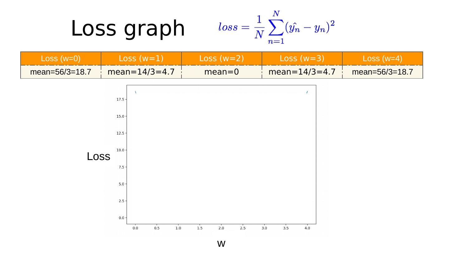 14 .Training Loss (error) Hours, x Loss (w=0) Loss (w=1) Loss (w=2) Loss (w=3) Loss (w=4) 1 4 1 0 1 4 2 16 4 0 4 16 3 36 9 0 9 36 MSE=56/3=18.7 MSE=14/3=4.7 MSE=0 MSE=14/3=4.7 MSE=56/3=18.7 MSE, mean square error