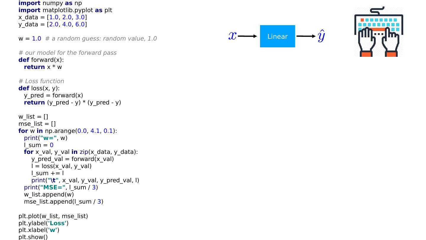 12 .Model & Loss w = 1.0 # a random guess: random value # our model for the forward pass def forward(x): return x * w # Loss function def loss(x, y): y_pred = forward(x) return (y_pred - y) * (y_pred - y)