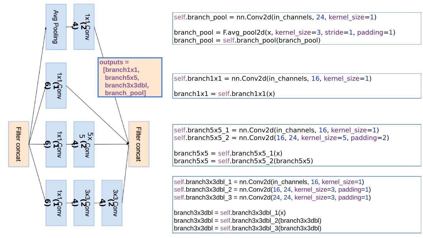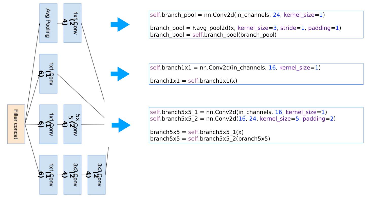 23 .self .branch1x1 = nn.Conv2d(in_channels, 16 , kernel_size = 1 ) branch1x1 = self .branch1x1(x) self .branch5x5_1 = nn.Conv2d(in_channels, 16 , kernel_size = 1 ) self .branch5x5_2 = nn.Conv2d( 16 , 24 , kernel_size = 5 , padding = 2 ) branch5x5 = self .branch5x5_1(x) branch5x5 = self .branch5x5_2(branch5x5) self .branch_pool = nn.Conv2d(in_channels, 24 , kernel_size = 1 ) branch_pool = F.avg_pool2d(x, kernel_size = 3 , stride = 1 , padding = 1 ) branch_pool = self .branch_pool(branch_pool) 5x5 (16) (16) (16) (24) (24) (24) (24)