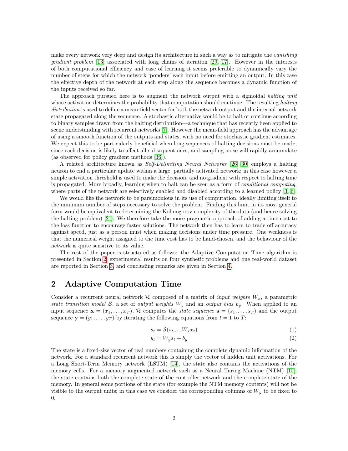 2 .make every network very deep and design its architecture in such a way as to mitigate the vanishing gradient problem [13] associated with long chains of iteration [29, 17]. However in the interests of both computational efficiency and ease of learning it seems preferable to dynamically vary the number of steps for which the network ‘ponders’ each input before emitting an output. In this case the effective depth of the network at each step along the sequence becomes a dynamic function of the inputs received so far. The approach pursued here is to augment the network output with a sigmoidal halting unit whose activation determines the probability that computation should continue. The resulting halting distribution is used to define a mean-field vector for both the network output and the internal network state propagated along the sequence. A stochastic alternative would be to halt or continue according to binary samples drawn from the halting distribution—a technique that has recently been applied to scene understanding with recurrent networks [7]. However the mean-field approach has the advantage of using a smooth function of the outputs and states, with no need for stochastic gradient estimates. We expect this to be particularly beneficial when long sequences of halting decisions must be made, since each decision is likely to affect all subsequent ones, and sampling noise will rapidly accumulate (as observed for policy gradient methods [36]). A related architecture known as Self-Delimiting Neural Networks [26, 30] employs a halting neuron to end a particular update within a large, partially activated network; in this case however a simple activation threshold is used to make the decision, and no gradient with respect to halting time is propagated. More broadly, learning when to halt can be seen as a form of conditional computing, where parts of the network are selectively enabled and disabled according to a learned policy [3, 6]. We would like the network to be parsimonious in its use of computation, ideally limiting itself to the minimum number of steps necessary to solve the problem. Finding this limit in its most general form would be equivalent to determining the Kolmogorov complexity of the data (and hence solving the halting problem) [21]. We therefore take the more pragmatic approach of adding a time cost to the loss function to encourage faster solutions. The network then has to learn to trade off accuracy against speed, just as a person must when making decisions under time pressure. One weakness is that the numerical weight assigned to the time cost has to be hand-chosen, and the behaviour of the network is quite sensitive to its value. The rest of the paper is structured as follows: the Adaptive Computation Time algorithm is presented in Section 2, experimental results on four synthetic problems and one real-world dataset are reported in Section 3, and concluding remarks are given in Section 4. 2 Adaptive Computation Time Consider a recurrent neural network R composed of a matrix of input weights Wx , a parametric state transition model S, a set of output weights Wy and an output bias by . When applied to an input sequence x = (x1 , . . . , xT ), R computes the state sequence s = (s1 , . . . , sT ) and the output sequence y = (y1 , . . . , yT ) by iterating the following equations from t = 1 to T : st = S(st−1 , Wx xt ) (1) yt = Wy st + by (2) The state is a fixed-size vector of real numbers containing the complete dynamic information of the network. For a standard recurrent network this is simply the vector of hidden unit activations. For a Long Short-Term Memory network (LSTM) [14], the state also contains the activations of the memory cells. For a memory augmented network such as a Neural Turing Machine (NTM) [10], the state contains both the complete state of the controller network and the complete state of the memory. In general some portions of the state (for example the NTM memory contents) will not be visible to the output units; in this case we consider the corresponding columns of Wy to be fixed to 0. 2