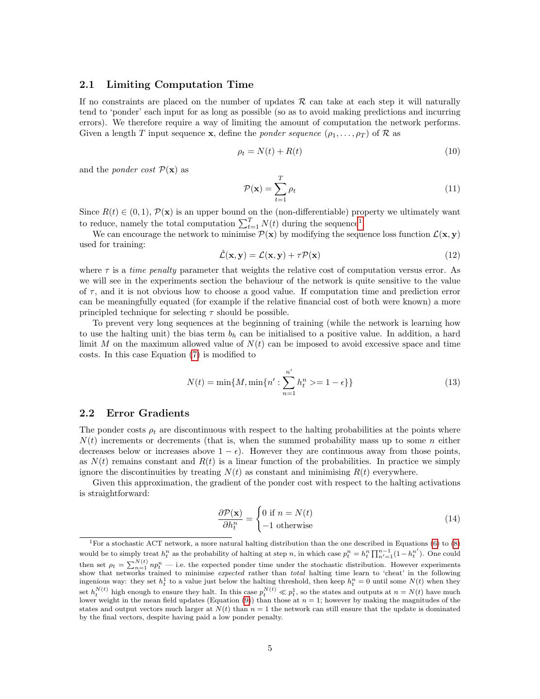 5 .2.1 Limiting Computation Time If no constraints are placed on the number of updates R can take at each step it will naturally tend to ‘ponder’ each input for as long as possible (so as to avoid making predictions and incurring errors). We therefore require a way of limiting the amount of computation the network performs. Given a length T input sequence x, define the ponder sequence (ρ1 , . . . , ρT ) of R as ρt = N (t) + R(t) (10) and the ponder cost P(x) as T P(x) = ρt (11) t=1 Since R(t) ∈ (0, 1), P(x) is an upper bound on the (non-differentiable) property we ultimately want T to reduce, namely the total computation t=1 N (t) during the sequence1 . We can encourage the network to minimise P(x) by modifying the sequence loss function L(x, y) used for training: ˆ y) = L(x, y) + τ P(x) L(x, (12) where τ is a time penalty parameter that weights the relative cost of computation versus error. As we will see in the experiments section the behaviour of the network is quite sensitive to the value of τ , and it is not obvious how to choose a good value. If computation time and prediction error can be meaningfully equated (for example if the relative financial cost of both were known) a more principled technique for selecting τ should be possible. To prevent very long sequences at the beginning of training (while the network is learning how to use the halting unit) the bias term bh can be initialised to a positive value. In addition, a hard limit M on the maximum allowed value of N (t) can be imposed to avoid excessive space and time costs. In this case Equation (7) is modified to n N (t) = min{M, min{n : hnt >= 1 − }} (13) n=1 2.2 Error Gradients The ponder costs ρt are discontinuous with respect to the halting probabilities at the points where N (t) increments or decrements (that is, when the summed probability mass up to some n either decreases below or increases above 1 − ). However they are continuous away from those points, as N (t) remains constant and R(t) is a linear function of the probabilities. In practice we simply ignore the discontinuities by treating N (t) as constant and minimising R(t) everywhere. Given this approximation, the gradient of the ponder cost with respect to the halting activations is straightforward: ∂P(x) 0 if n = N (t) = (14) ∂hnt −1 otherwise 1 For a stochastic ACT network, a more natural halting distribution than the one described in Equations (6) to (8) n−1 would be to simply treat hn n n t as the probability of halting at step n, in which case pt = ht n =1 (1 − hn t ). One could N (t) n then set ρt = n=1 npt — i.e. the expected ponder time under the stochastic distribution. However experiments show that networks trained to minimise expected rather than total halting time learn to ‘cheat’ in the following ingenious way: they set h1t to a value just below the halting threshold, then keep hn t = 0 until some N (t) when they N (t) N (t) set ht high enough to ensure they halt. In this case pt p1t , so the states and outputs at n = N (t) have much lower weight in the mean field updates (Equation (9)) than those at n = 1; however by making the magnitudes of the states and output vectors much larger at N (t) than n = 1 the network can still ensure that the update is dominated by the final vectors, despite having paid a low ponder penalty. 5