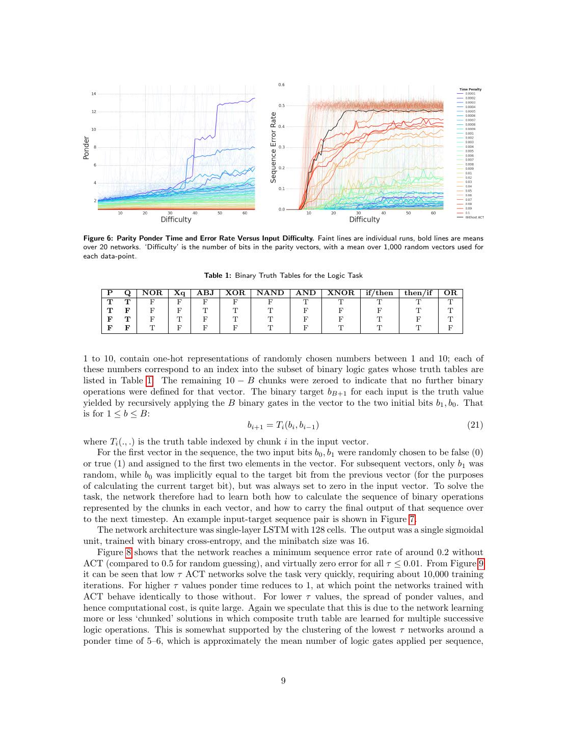 9 .Figure 6: Parity Ponder Time and Error Rate Versus Input Difficulty. Faint lines are individual runs, bold lines are means over 20 networks. ‘Difficulty’ is the number of bits in the parity vectors, with a mean over 1,000 random vectors used for each data-point. Table 1: Binary Truth Tables for the Logic Task P Q NOR Xq ABJ XOR NAND AND XNOR if/then then/if OR T T F F F F F T T T T T T F F F T T T F F F T T F T F T F T T F F T F T F F T F F F T F T T T F 1 to 10, contain one-hot representations of randomly chosen numbers between 1 and 10; each of these numbers correspond to an index into the subset of binary logic gates whose truth tables are listed in Table 1. The remaining 10 − B chunks were zeroed to indicate that no further binary operations were defined for that vector. The binary target bB+1 for each input is the truth value yielded by recursively applying the B binary gates in the vector to the two initial bits b1 , b0 . That is for 1 ≤ b ≤ B: bi+1 = Ti (bi , bi−1 ) (21) where Ti (., .) is the truth table indexed by chunk i in the input vector. For the first vector in the sequence, the two input bits b0 , b1 were randomly chosen to be false (0) or true (1) and assigned to the first two elements in the vector. For subsequent vectors, only b1 was random, while b0 was implicitly equal to the target bit from the previous vector (for the purposes of calculating the current target bit), but was always set to zero in the input vector. To solve the task, the network therefore had to learn both how to calculate the sequence of binary operations represented by the chunks in each vector, and how to carry the final output of that sequence over to the next timestep. An example input-target sequence pair is shown in Figure 7. The network architecture was single-layer LSTM with 128 cells. The output was a single sigmoidal unit, trained with binary cross-entropy, and the minibatch size was 16. Figure 8 shows that the network reaches a minimum sequence error rate of around 0.2 without ACT (compared to 0.5 for random guessing), and virtually zero error for all τ ≤ 0.01. From Figure 9 it can be seen that low τ ACT networks solve the task very quickly, requiring about 10,000 training iterations. For higher τ values ponder time reduces to 1, at which point the networks trained with ACT behave identically to those without. For lower τ values, the spread of ponder values, and hence computational cost, is quite large. Again we speculate that this is due to the network learning more or less ‘chunked’ solutions in which composite truth table are learned for multiple successive logic operations. This is somewhat supported by the clustering of the lowest τ networks around a ponder time of 5–6, which is approximately the mean number of logic gates applied per sequence, 9