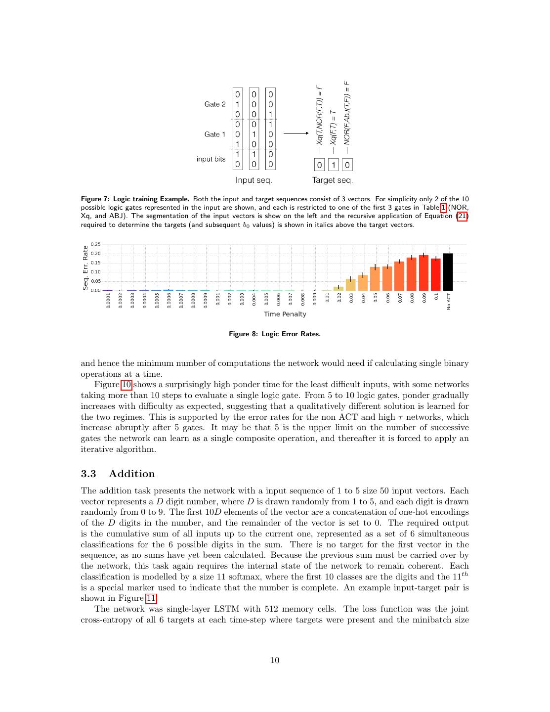10 .Figure 7: Logic training Example. Both the input and target sequences consist of 3 vectors. For simplicity only 2 of the 10 possible logic gates represented in the input are shown, and each is restricted to one of the first 3 gates in Table 1 (NOR, Xq, and ABJ). The segmentation of the input vectors is show on the left and the recursive application of Equation (21) required to determine the targets (and subsequent b0 values) is shown in italics above the target vectors. Figure 8: Logic Error Rates. and hence the minimum number of computations the network would need if calculating single binary operations at a time. Figure 10 shows a surprisingly high ponder time for the least difficult inputs, with some networks taking more than 10 steps to evaluate a single logic gate. From 5 to 10 logic gates, ponder gradually increases with difficulty as expected, suggesting that a qualitatively different solution is learned for the two regimes. This is supported by the error rates for the non ACT and high τ networks, which increase abruptly after 5 gates. It may be that 5 is the upper limit on the number of successive gates the network can learn as a single composite operation, and thereafter it is forced to apply an iterative algorithm. 3.3 Addition The addition task presents the network with a input sequence of 1 to 5 size 50 input vectors. Each vector represents a D digit number, where D is drawn randomly from 1 to 5, and each digit is drawn randomly from 0 to 9. The first 10D elements of the vector are a concatenation of one-hot encodings of the D digits in the number, and the remainder of the vector is set to 0. The required output is the cumulative sum of all inputs up to the current one, represented as a set of 6 simultaneous classifications for the 6 possible digits in the sum. There is no target for the first vector in the sequence, as no sums have yet been calculated. Because the previous sum must be carried over by the network, this task again requires the internal state of the network to remain coherent. Each classification is modelled by a size 11 softmax, where the first 10 classes are the digits and the 11th is a special marker used to indicate that the number is complete. An example input-target pair is shown in Figure 11. The network was single-layer LSTM with 512 memory cells. The loss function was the joint cross-entropy of all 6 targets at each time-step where targets were present and the minibatch size 10