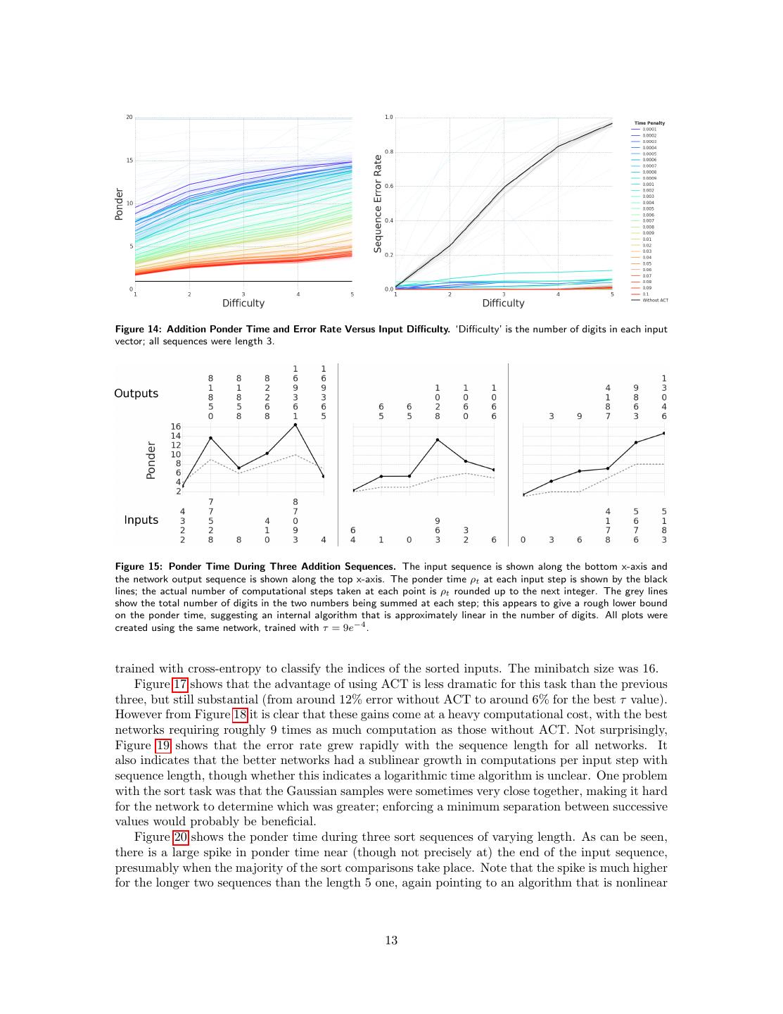 13 .Figure 14: Addition Ponder Time and Error Rate Versus Input Difficulty. ‘Difficulty’ is the number of digits in each input vector; all sequences were length 3. Figure 15: Ponder Time During Three Addition Sequences. The input sequence is shown along the bottom x-axis and the network output sequence is shown along the top x-axis. The ponder time ρt at each input step is shown by the black lines; the actual number of computational steps taken at each point is ρt rounded up to the next integer. The grey lines show the total number of digits in the two numbers being summed at each step; this appears to give a rough lower bound on the ponder time, suggesting an internal algorithm that is approximately linear in the number of digits. All plots were created using the same network, trained with τ = 9e−4 . trained with cross-entropy to classify the indices of the sorted inputs. The minibatch size was 16. Figure 17 shows that the advantage of using ACT is less dramatic for this task than the previous three, but still substantial (from around 12% error without ACT to around 6% for the best τ value). However from Figure 18 it is clear that these gains come at a heavy computational cost, with the best networks requiring roughly 9 times as much computation as those without ACT. Not surprisingly, Figure 19 shows that the error rate grew rapidly with the sequence length for all networks. It also indicates that the better networks had a sublinear growth in computations per input step with sequence length, though whether this indicates a logarithmic time algorithm is unclear. One problem with the sort task was that the Gaussian samples were sometimes very close together, making it hard for the network to determine which was greater; enforcing a minimum separation between successive values would probably be beneficial. Figure 20 shows the ponder time during three sort sequences of varying length. As can be seen, there is a large spike in ponder time near (though not precisely at) the end of the input sequence, presumably when the majority of the sort comparisons take place. Note that the spike is much higher for the longer two sequences than the length 5 one, again pointing to an algorithm that is nonlinear 13