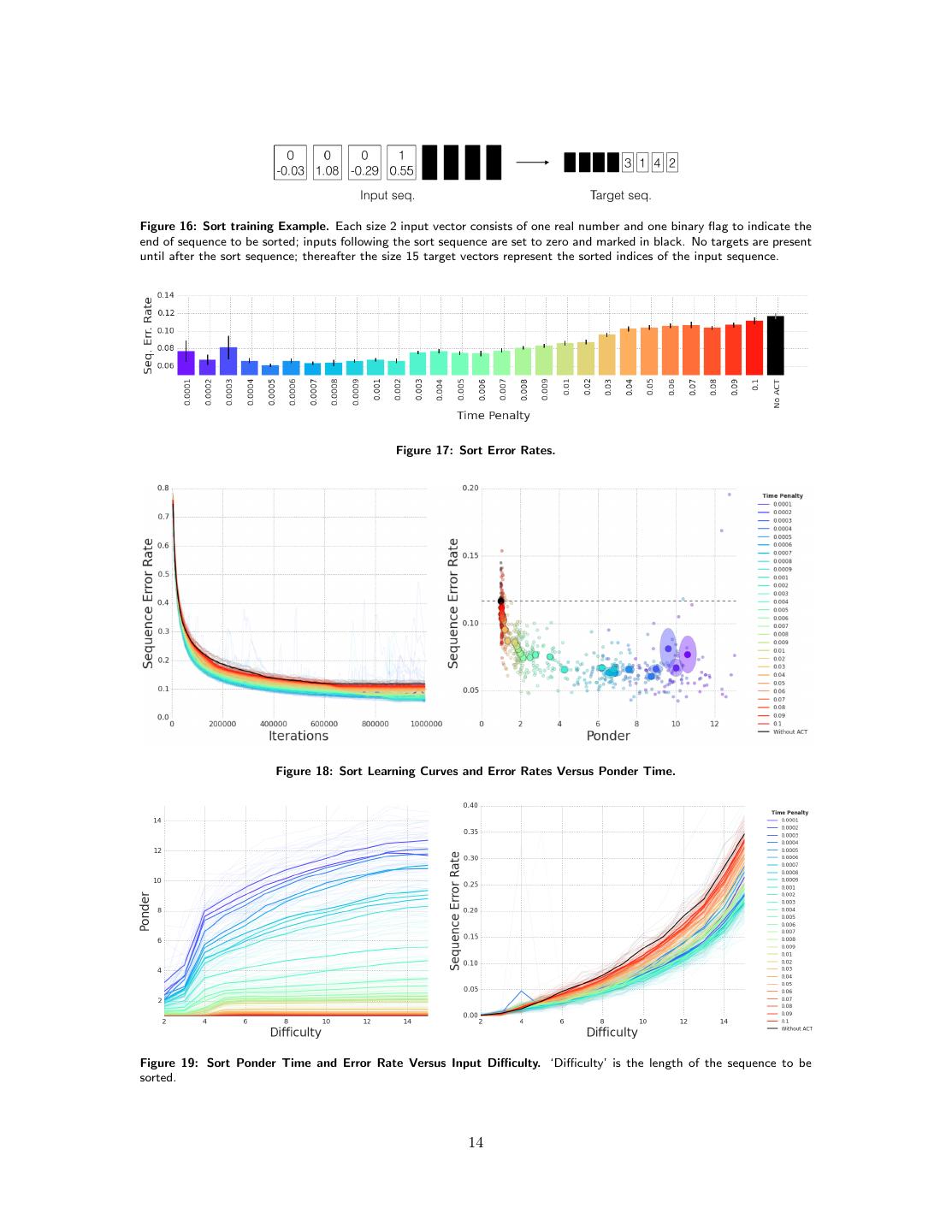 14 .Figure 16: Sort training Example. Each size 2 input vector consists of one real number and one binary flag to indicate the end of sequence to be sorted; inputs following the sort sequence are set to zero and marked in black. No targets are present until after the sort sequence; thereafter the size 15 target vectors represent the sorted indices of the input sequence. Figure 17: Sort Error Rates. Figure 18: Sort Learning Curves and Error Rates Versus Ponder Time. Figure 19: Sort Ponder Time and Error Rate Versus Input Difficulty. ‘Difficulty’ is the length of the sequence to be sorted. 14