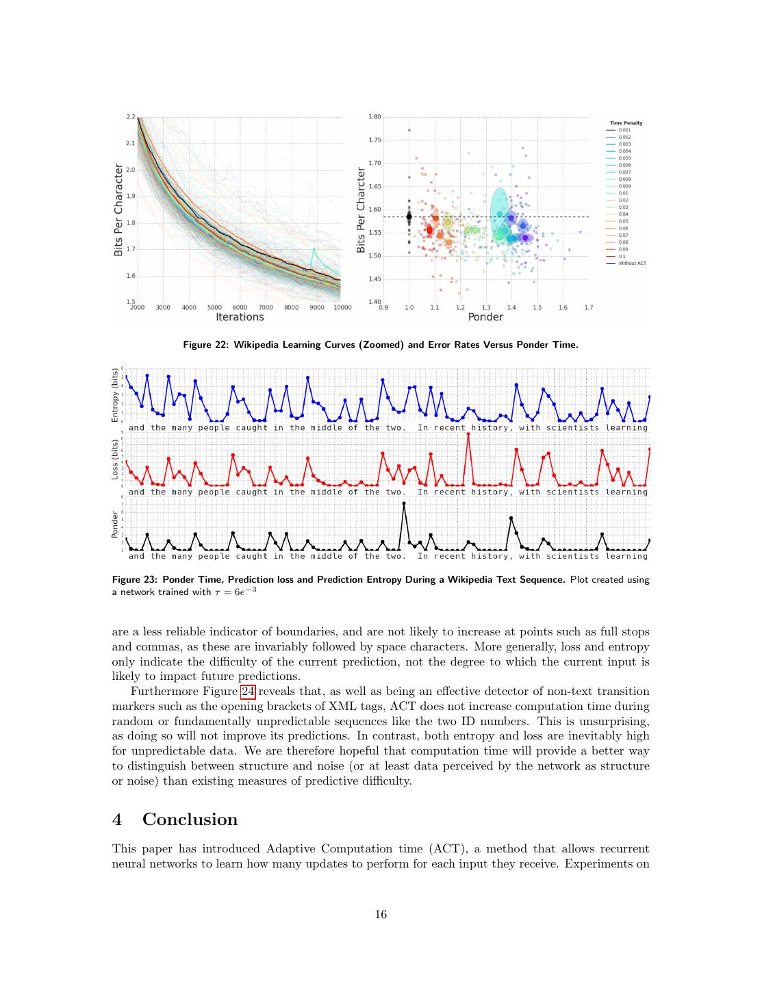 16 . Figure 22: Wikipedia Learning Curves (Zoomed) and Error Rates Versus Ponder Time. Figure 23: Ponder Time, Prediction loss and Prediction Entropy During a Wikipedia Text Sequence. Plot created using a network trained with τ = 6e−3 are a less reliable indicator of boundaries, and are not likely to increase at points such as full stops and commas, as these are invariably followed by space characters. More generally, loss and entropy only indicate the difficulty of the current prediction, not the degree to which the current input is likely to impact future predictions. Furthermore Figure 24 reveals that, as well as being an effective detector of non-text transition markers such as the opening brackets of XML tags, ACT does not increase computation time during random or fundamentally unpredictable sequences like the two ID numbers. This is unsurprising, as doing so will not improve its predictions. In contrast, both entropy and loss are inevitably high for unpredictable data. We are therefore hopeful that computation time will provide a better way to distinguish between structure and noise (or at least data perceived by the network as structure or noise) than existing measures of predictive difficulty. 4 Conclusion This paper has introduced Adaptive Computation time (ACT), a method that allows recurrent neural networks to learn how many updates to perform for each input they receive. Experiments on 16