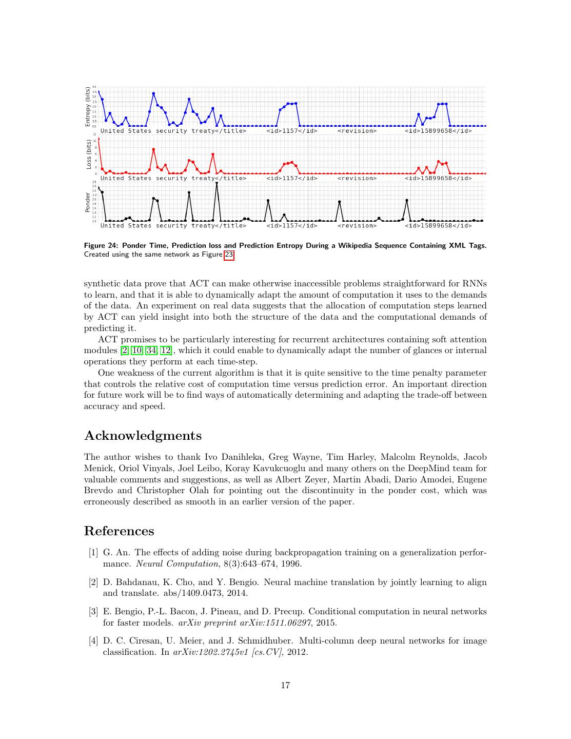 17 .Figure 24: Ponder Time, Prediction loss and Prediction Entropy During a Wikipedia Sequence Containing XML Tags. Created using the same network as Figure 23. synthetic data prove that ACT can make otherwise inaccessible problems straightforward for RNNs to learn, and that it is able to dynamically adapt the amount of computation it uses to the demands of the data. An experiment on real data suggests that the allocation of computation steps learned by ACT can yield insight into both the structure of the data and the computational demands of predicting it. ACT promises to be particularly interesting for recurrent architectures containing soft attention modules [2, 10, 34, 12], which it could enable to dynamically adapt the number of glances or internal operations they perform at each time-step. One weakness of the current algorithm is that it is quite sensitive to the time penalty parameter that controls the relative cost of computation time versus prediction error. An important direction for future work will be to find ways of automatically determining and adapting the trade-off between accuracy and speed. Acknowledgments The author wishes to thank Ivo Danihleka, Greg Wayne, Tim Harley, Malcolm Reynolds, Jacob Menick, Oriol Vinyals, Joel Leibo, Koray Kavukcuoglu and many others on the DeepMind team for valuable comments and suggestions, as well as Albert Zeyer, Martin Abadi, Dario Amodei, Eugene Brevdo and Christopher Olah for pointing out the discontinuity in the ponder cost, which was erroneously described as smooth in an earlier version of the paper. References [1] G. An. The effects of adding noise during backpropagation training on a generalization perfor- mance. Neural Computation, 8(3):643–674, 1996. [2] D. Bahdanau, K. Cho, and Y. Bengio. Neural machine translation by jointly learning to align and translate. abs/1409.0473, 2014. [3] E. Bengio, P.-L. Bacon, J. Pineau, and D. Precup. Conditional computation in neural networks for faster models. arXiv preprint arXiv:1511.06297, 2015. [4] D. C. Ciresan, U. Meier, and J. Schmidhuber. Multi-column deep neural networks for image classification. In arXiv:1202.2745v1 [cs.CV], 2012. 17