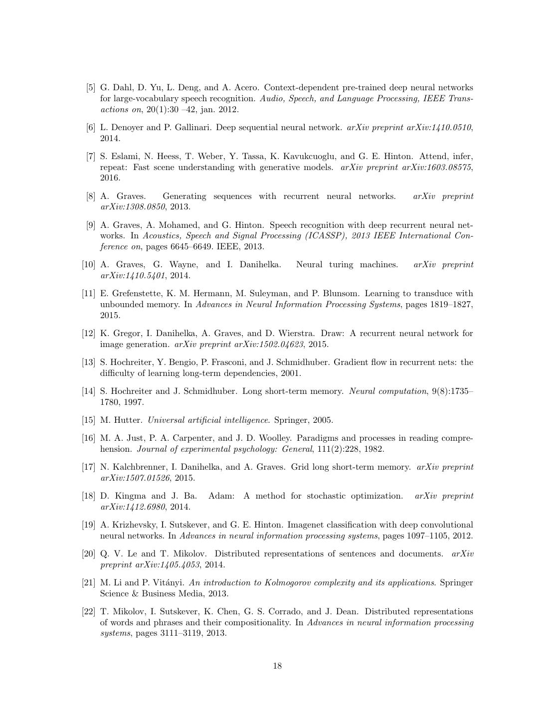 18 . [5] G. Dahl, D. Yu, L. Deng, and A. Acero. Context-dependent pre-trained deep neural networks for large-vocabulary speech recognition. Audio, Speech, and Language Processing, IEEE Trans- actions on, 20(1):30 –42, jan. 2012. [6] L. Denoyer and P. Gallinari. Deep sequential neural network. arXiv preprint arXiv:1410.0510, 2014. [7] S. Eslami, N. Heess, T. Weber, Y. Tassa, K. Kavukcuoglu, and G. E. Hinton. Attend, infer, repeat: Fast scene understanding with generative models. arXiv preprint arXiv:1603.08575, 2016. [8] A. Graves. Generating sequences with recurrent neural networks. arXiv preprint arXiv:1308.0850, 2013. [9] A. Graves, A. Mohamed, and G. Hinton. Speech recognition with deep recurrent neural net- works. In Acoustics, Speech and Signal Processing (ICASSP), 2013 IEEE International Con- ference on, pages 6645–6649. IEEE, 2013. [10] A. Graves, G. Wayne, and I. Danihelka. Neural turing machines. arXiv preprint arXiv:1410.5401, 2014. [11] E. Grefenstette, K. M. Hermann, M. Suleyman, and P. Blunsom. Learning to transduce with unbounded memory. In Advances in Neural Information Processing Systems, pages 1819–1827, 2015. [12] K. Gregor, I. Danihelka, A. Graves, and D. Wierstra. Draw: A recurrent neural network for image generation. arXiv preprint arXiv:1502.04623, 2015. [13] S. Hochreiter, Y. Bengio, P. Frasconi, and J. Schmidhuber. Gradient flow in recurrent nets: the difficulty of learning long-term dependencies, 2001. [14] S. Hochreiter and J. Schmidhuber. Long short-term memory. Neural computation, 9(8):1735– 1780, 1997. [15] M. Hutter. Universal artificial intelligence. Springer, 2005. [16] M. A. Just, P. A. Carpenter, and J. D. Woolley. Paradigms and processes in reading compre- hension. Journal of experimental psychology: General, 111(2):228, 1982. [17] N. Kalchbrenner, I. Danihelka, and A. Graves. Grid long short-term memory. arXiv preprint arXiv:1507.01526, 2015. [18] D. Kingma and J. Ba. Adam: A method for stochastic optimization. arXiv preprint arXiv:1412.6980, 2014. [19] A. Krizhevsky, I. Sutskever, and G. E. Hinton. Imagenet classification with deep convolutional neural networks. In Advances in neural information processing systems, pages 1097–1105, 2012. [20] Q. V. Le and T. Mikolov. Distributed representations of sentences and documents. arXiv preprint arXiv:1405.4053, 2014. [21] M. Li and P. Vit´ anyi. An introduction to Kolmogorov complexity and its applications. Springer Science & Business Media, 2013. [22] T. Mikolov, I. Sutskever, K. Chen, G. S. Corrado, and J. Dean. Distributed representations of words and phrases and their compositionality. In Advances in neural information processing systems, pages 3111–3119, 2013. 18