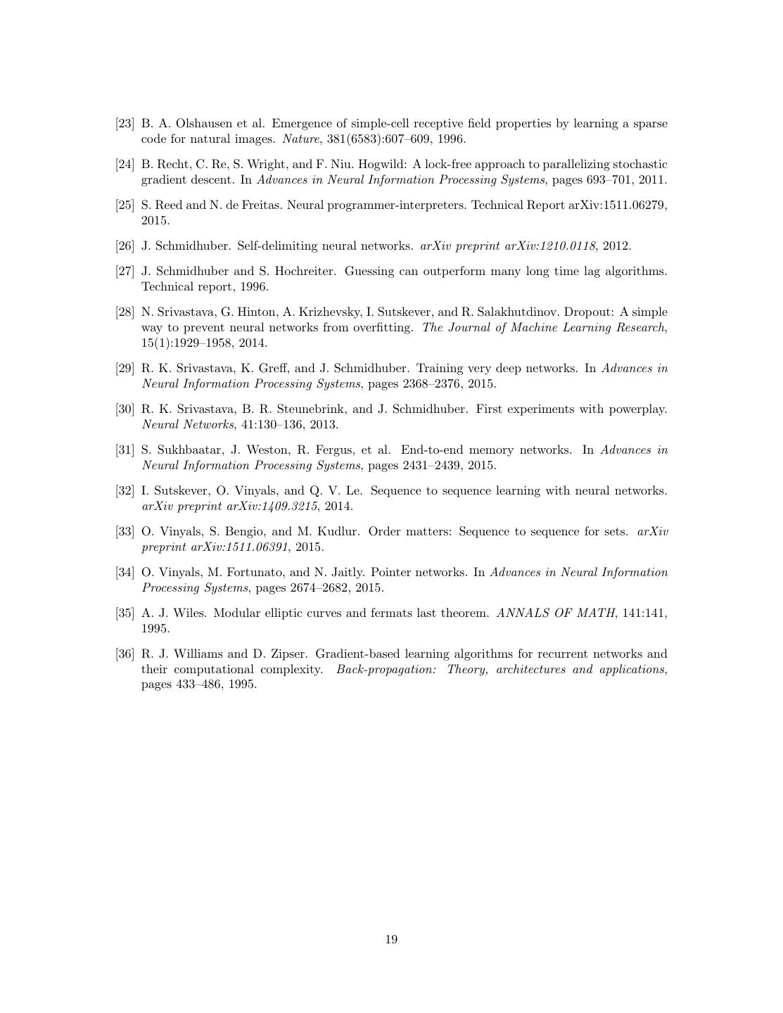 19 .[23] B. A. Olshausen et al. Emergence of simple-cell receptive field properties by learning a sparse code for natural images. Nature, 381(6583):607–609, 1996. [24] B. Recht, C. Re, S. Wright, and F. Niu. Hogwild: A lock-free approach to parallelizing stochastic gradient descent. In Advances in Neural Information Processing Systems, pages 693–701, 2011. [25] S. Reed and N. de Freitas. Neural programmer-interpreters. Technical Report arXiv:1511.06279, 2015. [26] J. Schmidhuber. Self-delimiting neural networks. arXiv preprint arXiv:1210.0118, 2012. [27] J. Schmidhuber and S. Hochreiter. Guessing can outperform many long time lag algorithms. Technical report, 1996. [28] N. Srivastava, G. Hinton, A. Krizhevsky, I. Sutskever, and R. Salakhutdinov. Dropout: A simple way to prevent neural networks from overfitting. The Journal of Machine Learning Research, 15(1):1929–1958, 2014. [29] R. K. Srivastava, K. Greff, and J. Schmidhuber. Training very deep networks. In Advances in Neural Information Processing Systems, pages 2368–2376, 2015. [30] R. K. Srivastava, B. R. Steunebrink, and J. Schmidhuber. First experiments with powerplay. Neural Networks, 41:130–136, 2013. [31] S. Sukhbaatar, J. Weston, R. Fergus, et al. End-to-end memory networks. In Advances in Neural Information Processing Systems, pages 2431–2439, 2015. [32] I. Sutskever, O. Vinyals, and Q. V. Le. Sequence to sequence learning with neural networks. arXiv preprint arXiv:1409.3215, 2014. [33] O. Vinyals, S. Bengio, and M. Kudlur. Order matters: Sequence to sequence for sets. arXiv preprint arXiv:1511.06391, 2015. [34] O. Vinyals, M. Fortunato, and N. Jaitly. Pointer networks. In Advances in Neural Information Processing Systems, pages 2674–2682, 2015. [35] A. J. Wiles. Modular elliptic curves and fermats last theorem. ANNALS OF MATH, 141:141, 1995. [36] R. J. Williams and D. Zipser. Gradient-based learning algorithms for recurrent networks and their computational complexity. Back-propagation: Theory, architectures and applications, pages 433–486, 1995. 19