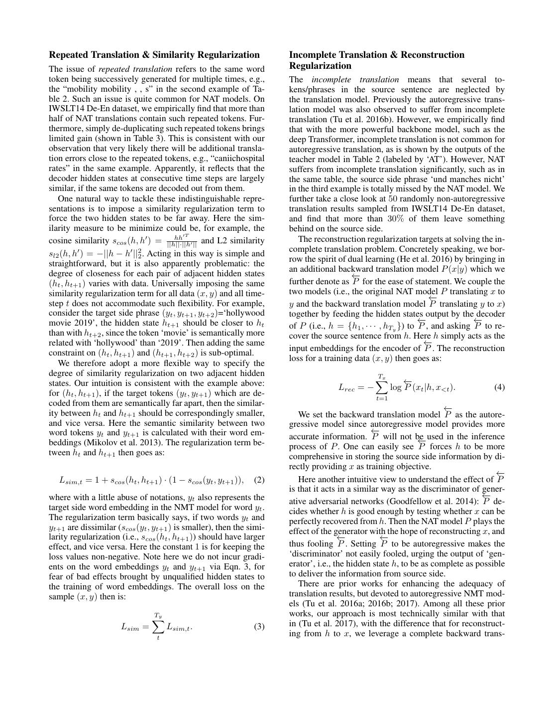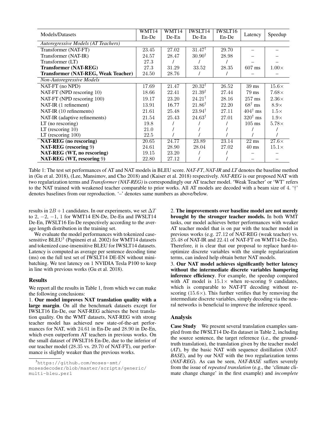 7 . Source: bei der coalergy sehen wir klimaver¨anderung als eine ernste gefahr f¨ur unser gesch¨aft . Reference: at coalergy we view climate change as a very serious threat to our business . AT: in coalergy , we see climate change as a serious threat to our business . NAT-BASE: in the coalergy , we 'll see climate climate change change as a most serious danger for our business . NAT-REG: at coalergy , we 're seeing climate change as a serious threat to our business . Source: dies ist die großartigste zeit , die es je auf diesem planeten gab , egal , welchen maßstab sie anlegen :gesundheit , reichtum , mobilit¨at , gelegenheiten , sinkende krankheitsraten . Reference: this is the greatest time there 's ever been on this planet by any measure that you wish to choose : health , wealth , mobility , opportunity , declining rates of disease . AT: this is the greatest time you 've ever had on this planet , no matter what scale you 're putting : health , wealth , mobility , opportunities , declining disease rates . NAT-BASE: this is the most greatest time that ever existed on this planet no matter what scale they 're imsi : : , , mobility mobility , , scaniichospital rates . NAT-REG: this is the greatest time that we 've ever been on this planet no matter what scale they 're ianition : health , wealth , mobility , opportunities , declining disease rates . Source: und manches davon hat funktioniert und manches nicht . Reference: and some of it worked , and some of it didn 't . AT: and some of it worked and some of it didn 't work . NAT-BASE: and some of it worked . NAT-REG: and some of it worked and some not . Table 2: Translation examples from IWSLT14 De-En task. The AT result is decoded with a beam size of 4 and NAT results are generated by re-scoring 9 candidates. We use the italic fonts to indicate the translation pieces where the NAT has the issue of incomplete translation, and bond fonts to indicate the issue of repeated translation. Model variants BLEU errors (repeated translation and incomplete translation) can NAT-BASE 28.73 be correlated to some extent and tackling one might help the NAT-BASE + de-duplication 29.45 alleviation of the other. For example, intuitively, given the NAT-BASE + universally penalize similarity 28.32 fixed target side length Ty , if repeated tokens are removed, NAT-BASE + similarity regularization 30.02 more ‘valid’ tokens will occupy the position, consequently NAT-BASE + reconstruction regularization 30.21 reducing the possibility of incomplete translation. NAT-BASE + both regularizations 30.84 Furthermore, we evaluate the effectiveness of alleviating repeated translations with our proposed approach. We count Table 3: Ablation study on IWLST14 De-En dev set. Results the number of de-duplication (de-dup) operations (for ex- are BLEU scores with teacher rescoring 9 candidates. ample, there are 2 de-dup operations for “we 'll see climate climate change change”). The per-sentence de-dup operations in IWSLT14 De-En dev set are 2.3 with NAT- translation (e.g., incomplete translation of ‘and some of it BASE, which has dropped to 0.9 with the introduction of didn 't’ in the third example), while with the two similarity regularization, clearly indicating the effectiveness auxiliary regularization terms brought in, the two issues are of the similarity regularization. largely alleviated. Ablation Study To further study the effects brought by Conclusions different techniques, we show in Table 3 the translation per- In this paper, we proposed two simple regularization strate- formance of different NAT model variants for the IWSLT14 gies to improve the performance of non-autoregressive ma- De-En translation task. We see that the BLEU of the basic chine translation (NAT) models, the similarity regularization NAT model could be enhanced via either of the two reg- and reconstruction regularization, which have been shown ularization terms by about 1 point. As a comparison, sim- to be effective for addressing two major problems of NAT ply de-duplicating the repeated tokens brings certain level models, i.e., the repeated translation and incomplete transla- of gain, and with the universal regularization that simply tion, respectively, consequently leading to quite strong per- penalizes the cosine similarity of all (ht , ht+1 ), the perfor- formance with fast decoding speed. mance even drops (from 28.73 to 28.32). When combining While the two regularization strategies were proposed to both regularization strategies, the BLEU score goes higher, improve NAT models, they may be generally applicable to which shows that the two regularization strategies are some- other sequence generation models. Exploring such poten- what complementary to each other. A noticeable fact is that tial would be an interesting direction for future research. the gain of combining both regularization strategies (about For example, we can apply our methods to other sequence 2.1) is lower than the sum of each individual gain (about generation tasks such as image caption and text summa- 2.8). One possible explanation may be that the two types of rization, with the hope of successfully deploying the non-