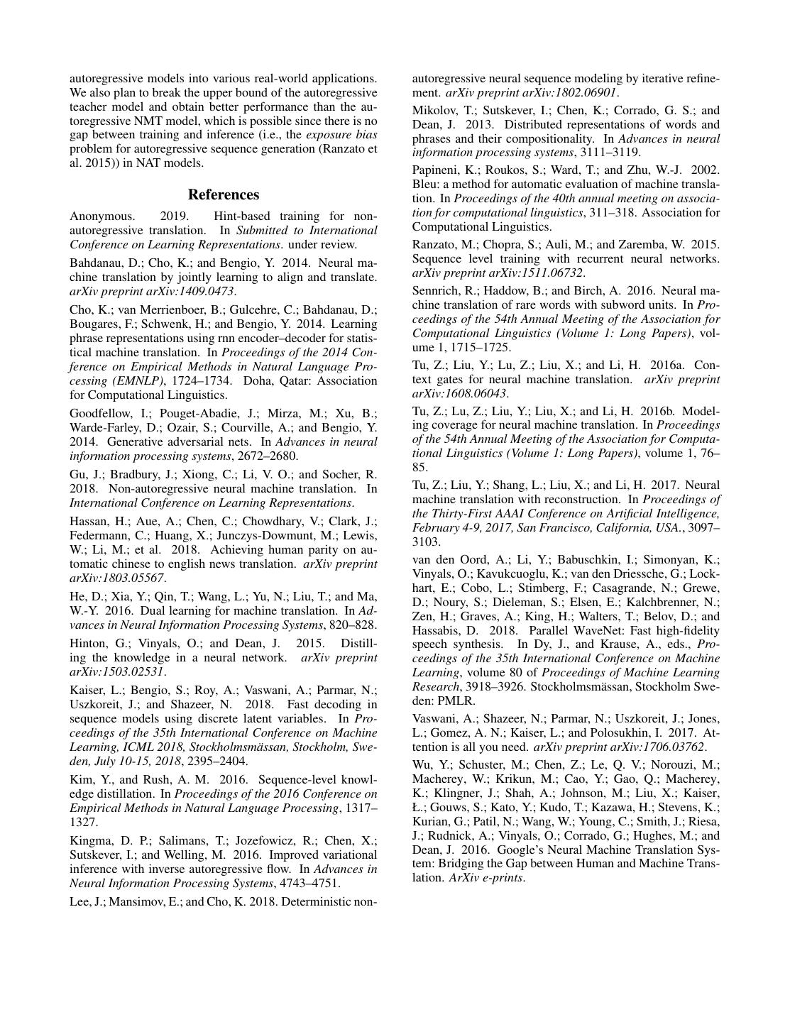8 .autoregressive models into various real-world applications. autoregressive neural sequence modeling by iterative refine- We also plan to break the upper bound of the autoregressive ment. arXiv preprint arXiv:1802.06901. teacher model and obtain better performance than the au- Mikolov, T.; Sutskever, I.; Chen, K.; Corrado, G. S.; and toregressive NMT model, which is possible since there is no Dean, J. 2013. Distributed representations of words and gap between training and inference (i.e., the exposure bias phrases and their compositionality. In Advances in neural problem for autoregressive sequence generation (Ranzato et information processing systems, 3111–3119. al. 2015)) in NAT models. Papineni, K.; Roukos, S.; Ward, T.; and Zhu, W.-J. 2002. Bleu: a method for automatic evaluation of machine transla- References tion. In Proceedings of the 40th annual meeting on associa- Anonymous. 2019. Hint-based training for non- tion for computational linguistics, 311–318. Association for autoregressive translation. In Submitted to International Computational Linguistics. Conference on Learning Representations. under review. Ranzato, M.; Chopra, S.; Auli, M.; and Zaremba, W. 2015. Bahdanau, D.; Cho, K.; and Bengio, Y. 2014. Neural ma- Sequence level training with recurrent neural networks. chine translation by jointly learning to align and translate. arXiv preprint arXiv:1511.06732. arXiv preprint arXiv:1409.0473. Sennrich, R.; Haddow, B.; and Birch, A. 2016. Neural ma- Cho, K.; van Merrienboer, B.; Gulcehre, C.; Bahdanau, D.; chine translation of rare words with subword units. In Pro- Bougares, F.; Schwenk, H.; and Bengio, Y. 2014. Learning ceedings of the 54th Annual Meeting of the Association for phrase representations using rnn encoder–decoder for statis- Computational Linguistics (Volume 1: Long Papers), vol- tical machine translation. In Proceedings of the 2014 Con- ume 1, 1715–1725. ference on Empirical Methods in Natural Language Pro- Tu, Z.; Liu, Y.; Lu, Z.; Liu, X.; and Li, H. 2016a. Con- cessing (EMNLP), 1724–1734. Doha, Qatar: Association text gates for neural machine translation. arXiv preprint for Computational Linguistics. arXiv:1608.06043. Goodfellow, I.; Pouget-Abadie, J.; Mirza, M.; Xu, B.; Tu, Z.; Lu, Z.; Liu, Y.; Liu, X.; and Li, H. 2016b. Model- Warde-Farley, D.; Ozair, S.; Courville, A.; and Bengio, Y. ing coverage for neural machine translation. In Proceedings 2014. Generative adversarial nets. In Advances in neural of the 54th Annual Meeting of the Association for Computa- information processing systems, 2672–2680. tional Linguistics (Volume 1: Long Papers), volume 1, 76– 85. Gu, J.; Bradbury, J.; Xiong, C.; Li, V. O.; and Socher, R. 2018. Non-autoregressive neural machine translation. In Tu, Z.; Liu, Y.; Shang, L.; Liu, X.; and Li, H. 2017. Neural International Conference on Learning Representations. machine translation with reconstruction. In Proceedings of the Thirty-First AAAI Conference on Artificial Intelligence, Hassan, H.; Aue, A.; Chen, C.; Chowdhary, V.; Clark, J.; February 4-9, 2017, San Francisco, California, USA., 3097– Federmann, C.; Huang, X.; Junczys-Dowmunt, M.; Lewis, 3103. W.; Li, M.; et al. 2018. Achieving human parity on au- tomatic chinese to english news translation. arXiv preprint van den Oord, A.; Li, Y.; Babuschkin, I.; Simonyan, K.; arXiv:1803.05567. Vinyals, O.; Kavukcuoglu, K.; van den Driessche, G.; Lock- hart, E.; Cobo, L.; Stimberg, F.; Casagrande, N.; Grewe, He, D.; Xia, Y.; Qin, T.; Wang, L.; Yu, N.; Liu, T.; and Ma, D.; Noury, S.; Dieleman, S.; Elsen, E.; Kalchbrenner, N.; W.-Y. 2016. Dual learning for machine translation. In Ad- Zen, H.; Graves, A.; King, H.; Walters, T.; Belov, D.; and vances in Neural Information Processing Systems, 820–828. Hassabis, D. 2018. Parallel WaveNet: Fast high-fidelity Hinton, G.; Vinyals, O.; and Dean, J. 2015. Distill- speech synthesis. In Dy, J., and Krause, A., eds., Pro- ing the knowledge in a neural network. arXiv preprint ceedings of the 35th International Conference on Machine arXiv:1503.02531. Learning, volume 80 of Proceedings of Machine Learning Kaiser, L.; Bengio, S.; Roy, A.; Vaswani, A.; Parmar, N.; Research, 3918–3926. Stockholmsm¨assan, Stockholm Swe- Uszkoreit, J.; and Shazeer, N. 2018. Fast decoding in den: PMLR. sequence models using discrete latent variables. In Pro- Vaswani, A.; Shazeer, N.; Parmar, N.; Uszkoreit, J.; Jones, ceedings of the 35th International Conference on Machine L.; Gomez, A. N.; Kaiser, L.; and Polosukhin, I. 2017. At- Learning, ICML 2018, Stockholmsm¨assan, Stockholm, Swe- tention is all you need. arXiv preprint arXiv:1706.03762. den, July 10-15, 2018, 2395–2404. Wu, Y.; Schuster, M.; Chen, Z.; Le, Q. V.; Norouzi, M.; Kim, Y., and Rush, A. M. 2016. Sequence-level knowl- Macherey, W.; Krikun, M.; Cao, Y.; Gao, Q.; Macherey, edge distillation. In Proceedings of the 2016 Conference on K.; Klingner, J.; Shah, A.; Johnson, M.; Liu, X.; Kaiser, Empirical Methods in Natural Language Processing, 1317– Ł.; Gouws, S.; Kato, Y.; Kudo, T.; Kazawa, H.; Stevens, K.; 1327. Kurian, G.; Patil, N.; Wang, W.; Young, C.; Smith, J.; Riesa, Kingma, D. P.; Salimans, T.; Jozefowicz, R.; Chen, X.; J.; Rudnick, A.; Vinyals, O.; Corrado, G.; Hughes, M.; and Sutskever, I.; and Welling, M. 2016. Improved variational Dean, J. 2016. Google’s Neural Machine Translation Sys- inference with inverse autoregressive flow. In Advances in tem: Bridging the Gap between Human and Machine Trans- Neural Information Processing Systems, 4743–4751. lation. ArXiv e-prints. Lee, J.; Mansimov, E.; and Cho, K. 2018. Deterministic non-