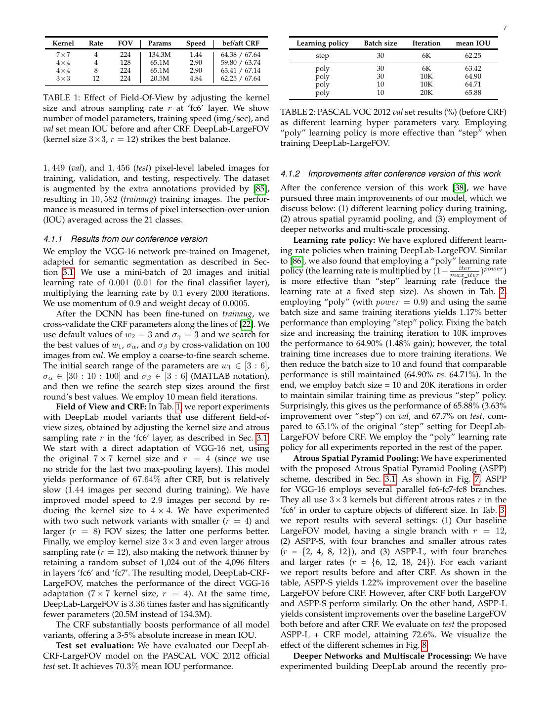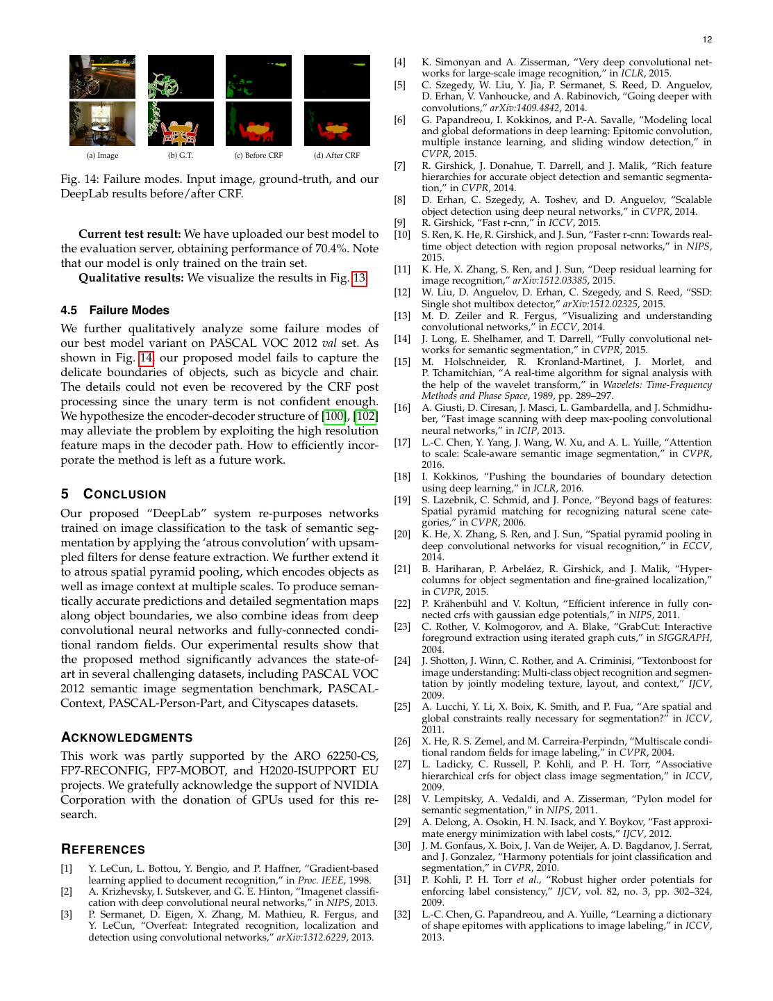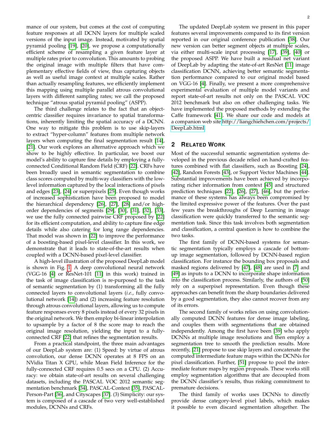 12 . 12 [4] K. Simonyan and A. Zisserman, “Very deep convolutional net- works for large-scale image recognition,” in ICLR, 2015. [5] C. Szegedy, W. Liu, Y. Jia, P. Sermanet, S. Reed, D. Anguelov, D. Erhan, V. Vanhoucke, and A. Rabinovich, “Going deeper with convolutions,” arXiv:1409.4842, 2014. [6] G. Papandreou, I. Kokkinos, and P.-A. Savalle, “Modeling local and global deformations in deep learning: Epitomic convolution, multiple instance learning, and sliding window detection,” in (a) Image (b) G.T. (c) Before CRF (d) After CRF CVPR, 2015. [7] R. Girshick, J. Donahue, T. Darrell, and J. Malik, “Rich feature Fig. 14: Failure modes. Input image, ground-truth, and our hierarchies for accurate object detection and semantic segmenta- tion,” in CVPR, 2014. DeepLab results before/after CRF. [8] D. Erhan, C. Szegedy, A. Toshev, and D. Anguelov, “Scalable object detection using deep neural networks,” in CVPR, 2014. [9] R. Girshick, “Fast r-cnn,” in ICCV, 2015. Current test result: We have uploaded our best model to [10] S. Ren, K. He, R. Girshick, and J. Sun, “Faster r-cnn: Towards real- the evaluation server, obtaining performance of 70.4%. Note time object detection with region proposal networks,” in NIPS, 2015. that our model is only trained on the train set. [11] K. He, X. Zhang, S. Ren, and J. Sun, “Deep residual learning for Qualitative results: We visualize the results in Fig. 13. image recognition,” arXiv:1512.03385, 2015. [12] W. Liu, D. Anguelov, D. Erhan, C. Szegedy, and S. Reed, “SSD: Single shot multibox detector,” arXiv:1512.02325, 2015. 4.5 Failure Modes [13] M. D. Zeiler and R. Fergus, “Visualizing and understanding We further qualitatively analyze some failure modes of convolutional networks,” in ECCV, 2014. our best model variant on PASCAL VOC 2012 val set. As [14] J. Long, E. Shelhamer, and T. Darrell, “Fully convolutional net- works for semantic segmentation,” in CVPR, 2015. shown in Fig. 14, our proposed model fails to capture the [15] M. Holschneider, R. Kronland-Martinet, J. Morlet, and delicate boundaries of objects, such as bicycle and chair. P. Tchamitchian, “A real-time algorithm for signal analysis with The details could not even be recovered by the CRF post the help of the wavelet transform,” in Wavelets: Time-Frequency Methods and Phase Space, 1989, pp. 289–297. processing since the unary term is not confident enough. [16] A. Giusti, D. Ciresan, J. Masci, L. Gambardella, and J. Schmidhu- We hypothesize the encoder-decoder structure of [100], [102] ber, “Fast image scanning with deep max-pooling convolutional may alleviate the problem by exploiting the high resolution neural networks,” in ICIP, 2013. feature maps in the decoder path. How to efficiently incor- [17] L.-C. Chen, Y. Yang, J. Wang, W. Xu, and A. L. Yuille, “Attention to scale: Scale-aware semantic image segmentation,” in CVPR, porate the method is left as a future work. 2016. [18] I. Kokkinos, “Pushing the boundaries of boundary detection using deep learning,” in ICLR, 2016. 5 C ONCLUSION [19] S. Lazebnik, C. Schmid, and J. Ponce, “Beyond bags of features: Our proposed “DeepLab” system re-purposes networks Spatial pyramid matching for recognizing natural scene cate- gories,” in CVPR, 2006. trained on image classification to the task of semantic seg- [20] K. He, X. Zhang, S. Ren, and J. Sun, “Spatial pyramid pooling in mentation by applying the ‘atrous convolution’ with upsam- deep convolutional networks for visual recognition,” in ECCV, pled filters for dense feature extraction. We further extend it 2014. to atrous spatial pyramid pooling, which encodes objects as [21] B. Hariharan, P. Arbel´aez, R. Girshick, and J. Malik, “Hyper- columns for object segmentation and fine-grained localization,” well as image context at multiple scales. To produce seman- in CVPR, 2015. tically accurate predictions and detailed segmentation maps [22] ¨ and V. Koltun, “Efficient inference in fully con- P. Kr¨ahenbuhl along object boundaries, we also combine ideas from deep nected crfs with gaussian edge potentials,” in NIPS, 2011. convolutional neural networks and fully-connected condi- [23] C. Rother, V. Kolmogorov, and A. Blake, “GrabCut: Interactive foreground extraction using iterated graph cuts,” in SIGGRAPH, tional random fields. Our experimental results show that 2004. the proposed method significantly advances the state-of- [24] J. Shotton, J. Winn, C. Rother, and A. Criminisi, “Textonboost for art in several challenging datasets, including PASCAL VOC image understanding: Multi-class object recognition and segmen- tation by jointly modeling texture, layout, and context,” IJCV, 2012 semantic image segmentation benchmark, PASCAL- 2009. Context, PASCAL-Person-Part, and Cityscapes datasets. [25] A. Lucchi, Y. Li, X. Boix, K. Smith, and P. Fua, “Are spatial and global constraints really necessary for segmentation?” in ICCV, 2011. ACKNOWLEDGMENTS [26] X. He, R. S. Zemel, and M. Carreira-Perpindn, “Multiscale condi- This work was partly supported by the ARO 62250-CS, tional random fields for image labeling,” in CVPR, 2004. [27] L. Ladicky, C. Russell, P. Kohli, and P. H. Torr, “Associative FP7-RECONFIG, FP7-MOBOT, and H2020-ISUPPORT EU hierarchical crfs for object class image segmentation,” in ICCV, projects. We gratefully acknowledge the support of NVIDIA 2009. Corporation with the donation of GPUs used for this re- [28] V. Lempitsky, A. Vedaldi, and A. Zisserman, “Pylon model for search. semantic segmentation,” in NIPS, 2011. [29] A. Delong, A. Osokin, H. N. Isack, and Y. Boykov, “Fast approxi- mate energy minimization with label costs,” IJCV, 2012. R EFERENCES [30] J. M. Gonfaus, X. Boix, J. Van de Weijer, A. D. Bagdanov, J. Serrat, and J. Gonzalez, “Harmony potentials for joint classification and [1] Y. LeCun, L. Bottou, Y. Bengio, and P. Haffner, “Gradient-based segmentation,” in CVPR, 2010. learn