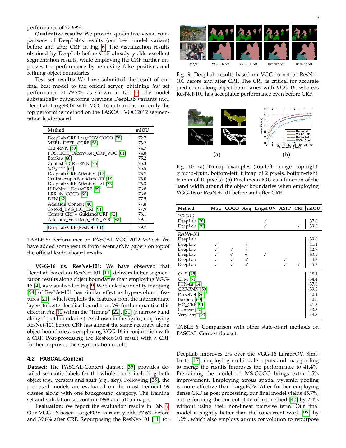 9 . 9 performance of 77.69%. Qualitative results: We provide qualitative visual com- parisons of DeepLab’s results (our best model variant) before and after CRF in Fig. 6. The visualization results obtained by DeepLab before CRF already yields excellent segmentation results, while employing the CRF further im- Image VGG-16 Bef. VGG-16 Aft. ResNet Bef. ResNet Aft. proves the performance by removing false positives and refining object boundaries. Fig. 9: DeepLab results based on VGG-16 net or ResNet- Test set results: We have submitted the result of our 101 before and after CRF. The CRF is critical for accurate final best model to the official server, obtaining test set prediction along object boundaries with VGG-16, whereas performance of 79.7%, as shown in Tab. 5. The model ResNet-101 has acceptable performance even before CRF. substantially outperforms previous DeepLab variants (e.g., DeepLab-LargeFOV with VGG-16 net) and is currently the 75 top performing method on the PASCAL VOC 2012 segmen- 70 tation leaderboard. mean IOU (%) 65 60 Method mIOU 55 ResNet aft VGG−16 aft DeepLab-CRF-LargeFOV-COCO [58] 72.7 50 ResNet bef VGG−16 bef MERL DEEP GCRF [88] 73.2 45 0 5 10 15 20 25 30 35 40 Trimap Width (pixels) CRF-RNN [59] 74.7 POSTECH DeconvNet CRF VOC [61] 74.8 (a) (b) BoxSup [60] 75.2 Context + CRF-RNN [76] 75.3 QO4mres [66] 75.5 Fig. 10: (a) Trimap examples (top-left: image. top-right: DeepLab-CRF-Attention [17] 75.7 ground-truth. bottom-left: trimap of 2 pixels. bottom-right: CentraleSuperBoundaries++ [18] 76.0 trimap of 10 pixels). (b) Pixel mean IOU as a function of the DeepLab-CRF-Attention-DT [63] 76.3 H-ReNet + DenseCRF [89] 76.8 band width around the object boundaries when employing LRR 4x COCO [90] 76.8 VGG-16 or ResNet-101 before and after CRF. DPN [62] 77.5 Adelaide Context [40] 77.8 Oxford TVG HO CRF [91] 77.9 Method MSC COCO Aug LargeFOV ASPP CRF mIOU Context CRF + Guidance CRF [92] 78.1 VGG-16 Adelaide VeryDeep FCN VOC [93] 79.1 DeepLab [38] 37.6 DeepLab-CRF (ResNet-101) 79.7 DeepLab [38] 39.6 ResNet-101 TABLE 5: Performance on PASCAL VOC 2012 test set. We DeepLab 39.6 have added some results from recent arXiv papers on top of DeepLab 41.4 DeepLab 42.9 the official leadearboard results. DeepLab 43.5 DeepLab 44.7 VGG-16 vs. ResNet-101: We have observed that DeepLab 45.7 DeepLab based on ResNet-101 [11] delivers better segmen- O2 P [45] 18.1 tation results along object boundaries than employing VGG- CFM [51] 34.4 16 [4], as visualized in Fig. 9. We think the identity mapping FCN-8s [14] 37.8 CRF-RNN [59] 39.3 [94] of ResNet-101 has similar effect as hyper-column fea- ParseNet [86] 40.4 tures [21], which exploits the features from the intermediate BoxSup [60] 40.5 layers to better localize boundaries. We further quantize this HO CRF [91] 41.3 Context [40] 43.3 effect in Fig. 10 within the “trimap” [22], [31] (a narrow band VeryDeep [93] 44.5 along object boundaries). As shown in the figure, employing ResNet-101 before CRF has almost the same accuracy along TABLE 6: Comparison with other state-of-art methods on object boundaries as employing VGG-16 in conjunction with PASCAL-Context dataset. a CRF. Post-processing the ResNet-101 result with a CRF further improves the segmentation result. DeepLab improves 2% over the VGG-16 LargeFOV. Simi- 4.2 PASCAL-Context lar to [17], employing multi-scale inputs and max-pooling Dataset: The PASCAL-Context dataset [35] provides de- to merge the results improves the performance to 41.4%. tailed semantic labels for the whole scene, including both Pretraining the model on MS-COCO brings extra 1.5% object (e.g., person) and stuff (e.g., sky). Following [35], the improvement. Employing atrous spatial pyramid pooling proposed models are evaluated on the most frequent 59 is more effective than LargeFOV. After further employing classes along with one background category. The training dense CRF as post processing, our final model yields 45.7%, set and validation set contain 4998 and 5105 images. outperforming the current state-of-art method [40] by 2.4% Evaluation: We report the evaluation results in Tab. 6. without using their non-linear pairwise term. Our final Our VGG-16 based LargeFOV variant yields 37.6% before model is slightly better than the concurrent work [93] by and 39.6% after CRF. Repurposing the ResNet-101 [11] for 1.2%, which also employs atrous convolution to repurpose