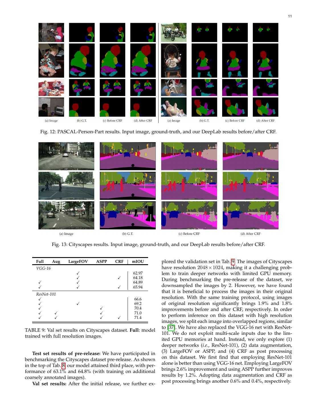 11 . 11 Fig. 12: PASCAL-Person-Part results. Input image, ground-truth, and our DeepLab results before/after CRF. Fig. 13: Cityscapes results. Input image, ground-truth, and our DeepLab results before/after CRF. Full Aug LargeFOV ASPP CRF mIOU plored the validation set in Tab. 9. The images of Cityscapes VGG-16 have resolution 2048×1024, making it a challenging prob- 62.97 lem to train deeper networks with limited GPU memory. 64.18 During benchmarking the pre-release of the dataset, we 64.89 65.94 downsampled the images by 2. However, we have found that it is beneficial to process the images in their original ResNet-101 66.6 resolution. With the same training protocol, using images 69.2 of original resolution significantly brings 1.9% and 1.8% 70.4 improvements before and after CRF, respectively. In order 71.0 71.4 to perform inference on this dataset with high resolution images, we split each image into overlapped regions, similar to [37]. We have also replaced the VGG-16 net with ResNet- TABLE 9: Val set results on Cityscapes dataset. Full: model 101. We do not exploit multi-scale inputs due to the lim- trained with full resolution images. ited GPU memories at hand. Instead, we only explore (1) deeper networks (i.e., ResNet-101), (2) data augmentation, Test set results of pre-release: We have participated in (3) LargeFOV or ASPP, and (4) CRF as post processing benchmarking the Cityscapes dataset pre-release. As shown on this dataset. We first find that employing ResNet-101 in the top of Tab. 8, our model attained third place, with per- alone is better than using VGG-16 net. Employing LargeFOV formance of 63.1% and 64.8% (with training on additional brings 2.6% improvement and using ASPP further improves coarsely annotated images). results by 1.2%. Adopting data augmentation and CRF as post processing brings another 0.6% and 0.4%, respectively. Val set results: After the initial release, we further ex-