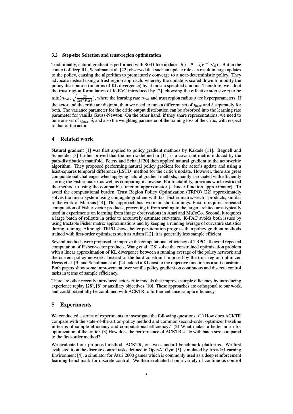 5 .3.2 Step-size Selection and trust-region optimization Traditionally, natural gradient is performed with SGD-like updates, θ ← θ − ηF −1 ∇θ L. But in the context of deep RL, Schulman et al. [22] observed that such an update rule can result in large updates to the policy, causing the algorithm to prematurely converge to a near-deterministic policy. They advocate instead using a trust region approach, whereby the update is scaled down to modify the policy distribution (in terms of KL divergence) by at most a specified amount. Therefore, we adopt the trust region formulation of K-FAC introduced by [2], choosing the effective step size η to be min(ηmax , ∆θ⊺2δFˆ ∆θ ), where the learning rate ηmax and trust region radius δ are hyperparameters. If the actor and the critic are disjoint, then we need to tune a different set of ηmax and δ separately for both. The variance parameter for the critic output distribution can be absorbed into the learning rate parameter for vanilla Gauss-Newton. On the other hand, if they share representations, we need to tune one set of ηmax , δ, and also the weighting parameter of the training loss of the critic, with respect to that of the actor. 4 Related work Natural gradient [1] was first applied to policy gradient methods by Kakade [11]. Bagnell and Schneider [3] further proved that the metric defined in [11] is a covariant metric induced by the path-distribution manifold. Peters and Schaal [20] then applied natural gradient to the actor-critic algorithm. They proposed performing natural policy gradient for the actor’s update and using a least-squares temporal difference (LSTD) method for the critic’s update. However, there are great computational challenges when applying natural gradient methods, mainly associated with efficiently storing the Fisher matrix as well as computing its inverse. For tractability, previous work restricted the method to using the compatible function approximator (a linear function approximator). To avoid the computational burden, Trust Region Policy Optimization (TRPO) [22] approximately solves the linear system using conjugate gradient with fast Fisher matrix-vector products, similar to the work of Martens [14]. This approach has two main shortcomings. First, it requires repeated computation of Fisher vector products, preventing it from scaling to the larger architectures typically used in experiments on learning from image observations in Atari and MuJoCo. Second, it requires a large batch of rollouts in order to accurately estimate curvature. K-FAC avoids both issues by using tractable Fisher matrix approximations and by keeping a running average of curvature statistics during training. Although TRPO shows better per-iteration progress than policy gradient methods trained with first-order optimizers such as Adam [12], it is generally less sample efficient. Several methods were proposed to improve the computational efficiency of TRPO. To avoid repeated computation of Fisher-vector products, Wang et al. [28] solve the constrained optimization problem with a linear approximation of KL divergence between a running average of the policy network and the current policy network. Instead of the hard constraint imposed by the trust region optimizer, Heess et al. [9] and Schulman et al. [24] added a KL cost to the objective function as a soft constraint. Both papers show some improvement over vanilla policy gradient on continuous and discrete control tasks in terms of sample efficiency. There are other recently introduced actor-critic models that improve sample efficiency by introducing experience replay [28], [8] or auxiliary objectives [10]. These approaches are orthogonal to our work, and could potentially be combined with ACKTR to further enhance sample efficiency. 5 Experiments We conducted a series of experiments to investigate the following questions: (1) How does ACKTR compare with the state-of-the-art on-policy method and common second-order optimizer baseline in terms of sample efficiency and computational efficiency? (2) What makes a better norm for optimization of the critic? (3) How does the performance of ACKTR scale with batch size compared to the first-order method? We evaluated our proposed method, ACKTR, on two standard benchmark platforms. We first evaluated it on the discrete control tasks defined in OpenAI Gym [5], simulated by Arcade Learning Environment [4], a simulator for Atari 2600 games which is commonly used as a deep reinforcement learning benchmark for discrete control. We then evaluated it on a variety of continuous control 5