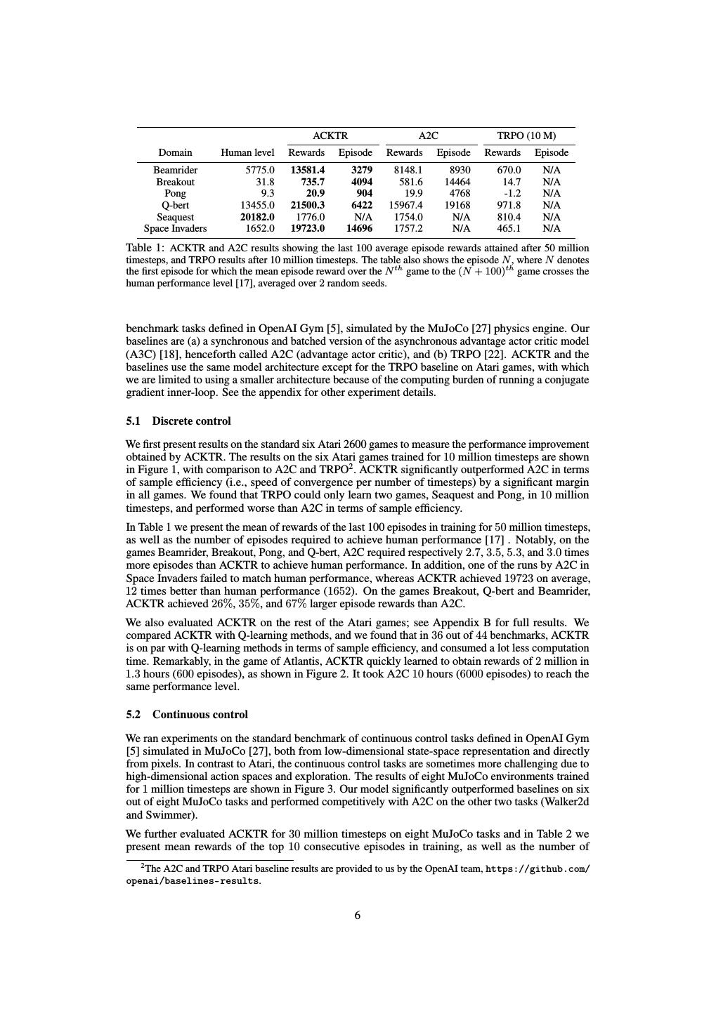 6 . ACKTR A2C TRPO (10 M) Domain Human level Rewards Episode Rewards Episode Rewards Episode Beamrider 5775.0 13581.4 3279 8148.1 8930 670.0 N/A Breakout 31.8 735.7 4094 581.6 14464 14.7 N/A Pong 9.3 20.9 904 19.9 4768 -1.2 N/A Q-bert 13455.0 21500.3 6422 15967.4 19168 971.8 N/A Seaquest 20182.0 1776.0 N/A 1754.0 N/A 810.4 N/A Space Invaders 1652.0 19723.0 14696 1757.2 N/A 465.1 N/A Table 1: ACKTR and A2C results showing the last 100 average episode rewards attained after 50 million timesteps, and TRPO results after 10 million timesteps. The table also shows the episode N , where N denotes the first episode for which the mean episode reward over the N th game to the (N + 100)th game crosses the human performance level [17], averaged over 2 random seeds. benchmark tasks defined in OpenAI Gym [5], simulated by the MuJoCo [27] physics engine. Our baselines are (a) a synchronous and batched version of the asynchronous advantage actor critic model (A3C) [18], henceforth called A2C (advantage actor critic), and (b) TRPO [22]. ACKTR and the baselines use the same model architecture except for the TRPO baseline on Atari games, with which we are limited to using a smaller architecture because of the computing burden of running a conjugate gradient inner-loop. See the appendix for other experiment details. 5.1 Discrete control We first present results on the standard six Atari 2600 games to measure the performance improvement obtained by ACKTR. The results on the six Atari games trained for 10 million timesteps are shown in Figure 1, with comparison to A2C and TRPO2 . ACKTR significantly outperformed A2C in terms of sample efficiency (i.e., speed of convergence per number of timesteps) by a significant margin in all games. We found that TRPO could only learn two games, Seaquest and Pong, in 10 million timesteps, and performed worse than A2C in terms of sample efficiency. In Table 1 we present the mean of rewards of the last 100 episodes in training for 50 million timesteps, as well as the number of episodes required to achieve human performance [17] . Notably, on the games Beamrider, Breakout, Pong, and Q-bert, A2C required respectively 2.7, 3.5, 5.3, and 3.0 times more episodes than ACKTR to achieve human performance. In addition, one of the runs by A2C in Space Invaders failed to match human performance, whereas ACKTR achieved 19723 on average, 12 times better than human performance (1652). On the games Breakout, Q-bert and Beamrider, ACKTR achieved 26%, 35%, and 67% larger episode rewards than A2C. We also evaluated ACKTR on the rest of the Atari games; see Appendix B for full results. We compared ACKTR with Q-learning methods, and we found that in 36 out of 44 benchmarks, ACKTR is on par with Q-learning methods in terms of sample efficiency, and consumed a lot less computation time. Remarkably, in the game of Atlantis, ACKTR quickly learned to obtain rewards of 2 million in 1.3 hours (600 episodes), as shown in Figure 2. It took A2C 10 hours (6000 episodes) to reach the same performance level. 5.2 Continuous control We ran experiments on the standard benchmark of continuous control tasks defined in OpenAI Gym [5] simulated in MuJoCo [27], both from low-dimensional state-space representation and directly from pixels. In contrast to Atari, the continuous control tasks are sometimes more challenging due to high-dimensional action spaces and exploration. The results of eight MuJoCo environments trained for 1 million timesteps are shown in Figure 3. Our model significantly outperformed baselines on six out of eight MuJoCo tasks and performed competitively with A2C on the other two tasks (Walker2d and Swimmer). We further evaluated ACKTR for 30 million timesteps on eight MuJoCo tasks and in Table 2 we present mean rewards of the top 10 consecutive episodes in training, as well as the number of 2 The A2C and TRPO Atari baseline results are provided to us by the OpenAI team, https://github.com/ openai/baselines-results. 6