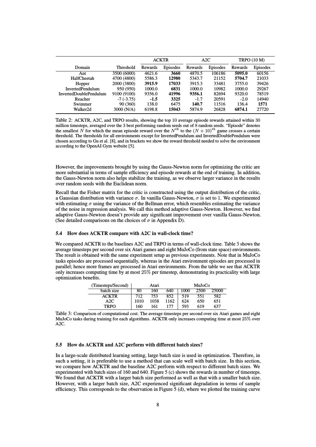 8 . ACKTR A2C TRPO (10 M) Domain Threshold Rewards Episodes Rewards Episodes Rewards Episodes Ant 3500 (6000) 4621.6 3660 4870.5 106186 5095.0 60156 HalfCheetah 4700 (4800) 5586.3 12980 5343.7 21152 5704.7 21033 Hopper 2000 (3800) 3915.9 17033 3915.3 33481 3755.0 39426 InvertedPendulum 950 (950) 1000.0 6831 1000.0 10982 1000.0 29267 InvertedDoublePendulum 9100 (9100) 9356.0 41996 9356.1 82694 9320.0 78519 Reacher -7 (-3.75) -1.5 3325 -1.7 20591 -2.0 14940 Swimmer 90 (360) 138.0 6475 140.7 11516 136.4 1571 Walker2d 3000 (N/A) 6198.8 15043 5874.9 26828 6874.1 27720 Table 2: ACKTR, A2C, and TRPO results, showing the top 10 average episode rewards attained within 30 million timesteps, averaged over the 3 best performing random seeds out of 8 random seeds. “Episode” denotes the smallest N for which the mean episode reward over the N th to the (N + 10)th game crosses a certain threshold. The thresholds for all environments except for InvertedPendulum and InvertedDoublePendulum were chosen according to Gu et al. [8], and in brackets we show the reward threshold needed to solve the environment according to the OpenAI Gym website [5]. However, the improvements brought by using the Gauss-Newton norm for optimizing the critic are more substantial in terms of sample efficiency and episode rewards at the end of training. In addition, the Gauss-Newton norm also helps stabilize the training, as we observe larger variance in the results over random seeds with the Euclidean norm. Recall that the Fisher matrix for the critic is constructed using the output distribution of the critic, a Gaussian distribution with variance σ. In vanilla Gauss-Newton, σ is set to 1. We experimented with estimating σ using the variance of the Bellman error, which resembles estimating the variance of the noise in regression analysis. We call this method adaptive Gauss-Newton. However, we find adaptive Gauss-Newton doesn’t provide any significant improvement over vanilla Gauss-Newton. (See detailed comparisons on the choices of σ in Appendix D). 5.4 How does ACKTR compare with A2C in wall-clock time? We compared ACKTR to the baselines A2C and TRPO in terms of wall-clock time. Table 3 shows the average timesteps per second over six Atari games and eight MuJoCo (from state space) environments. The result is obtained with the same experiment setup as previous experiments. Note that in MuJoCo tasks episodes are processed sequentially, whereas in the Atari environment episodes are processed in parallel; hence more frames are processed in Atari environments. From the table we see that ACKTR only increases computing time by at most 25% per timestep, demonstrating its practicality with large optimization benefits. (Timesteps/Second) Atari MuJoCo batch size 80 160 640 1000 2500 25000 ACKTR 712 753 852 519 551 582 A2C 1010 1038 1162 624 650 651 TRPO 160 161 177 593 619 637 Table 3: Comparison of computational cost. The average timesteps per second over six Atari games and eight MuJoCo tasks during training for each algorithms. ACKTR only increases computing time at most 25% over A2C. 5.5 How do ACKTR and A2C perform with different batch sizes? In a large-scale distributed learning setting, large batch size is used in optimization. Therefore, in such a setting, it is preferable to use a method that can scale well with batch size. In this section, we compare how ACKTR and the baseline A2C perform with respect to different batch sizes. We experimented with batch sizes of 160 and 640. Figure 5 (c) shows the rewards in number of timesteps. We found that ACKTR with a larger batch size performed as well as that with a smaller batch size. However, with a larger batch size, A2C experienced significant degradation in terms of sample efficiency. This corresponds to the observation in Figure 5 (d), where we plotted the training curve 8