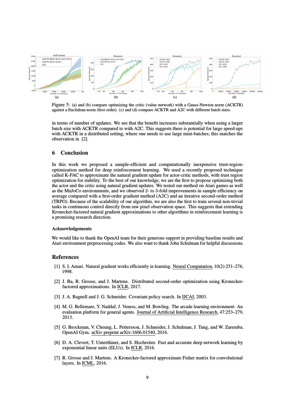 9 . (a) (b) (c) (d) Figure 5: (a) and (b) compare optimizing the critic (value network) with a Gauss-Newton norm (ACKTR) against a Euclidean norm (first order). (c) and (d) compare ACKTR and A2C with different batch sizes. in terms of number of updates. We see that the benefit increases substantially when using a larger batch size with ACKTR compared to with A2C. This suggests there is potential for large speed-ups with ACKTR in a distributed setting, where one needs to use large mini-batches; this matches the observation in [2]. 6 Conclusion In this work we proposed a sample-efficient and computationally inexpensive trust-region- optimization method for deep reinforcement learning. We used a recently proposed technique called K-FAC to approximate the natural gradient update for actor-critic methods, with trust region optimization for stability. To the best of our knowledge, we are the first to propose optimizing both the actor and the critic using natural gradient updates. We tested our method on Atari games as well as the MuJoCo environments, and we observed 2- to 3-fold improvements in sample efficiency on average compared with a first-order gradient method (A2C) and an iterative second-order method (TRPO). Because of the scalability of our algorithm, we are also the first to train several non-trivial tasks in continuous control directly from raw pixel observation space. This suggests that extending Kronecker-factored natural gradient approximations to other algorithms in reinforcement learning is a promising research direction. Acknowledgements We would like to thank the OpenAI team for their generous support in providing baseline results and Atari environment preprocessing codes. We also want to thank John Schulman for helpful discussions. References [1] S. I. Amari. Natural gradient works efficiently in learning. Neural Computation, 10(2):251–276, 1998. [2] J. Ba, R. Grosse, and J. Martens. Distributed second-order optimization using Kronecker- factored approximations. In ICLR, 2017. [3] J. A. Bagnell and J. G. Schneider. Covariant policy search. In IJCAI, 2003. [4] M. G. Bellemare, Y. Naddaf, J. Veness, and M. Bowling. The arcade learning environment: An evaluation platform for general agents. Journal of Artificial Intelligence Research, 47:253–279, 2013. [5] G. Brockman, V. Cheung, L. Pettersson, J. Schneider, J. Schulman, J. Tang, and W. Zaremba. OpenAI Gym. arXiv preprint arXiv:1606.01540, 2016. [6] D. A. Clevert, T. Unterthiner, and S. Hochreiter. Fast and accurate deep network learning by exponential linear units (ELUs). In ICLR, 2016. [7] R. Grosse and J. Martens. A Kronecker-factored approximate Fisher matrix for convolutional layers. In ICML, 2016. 9