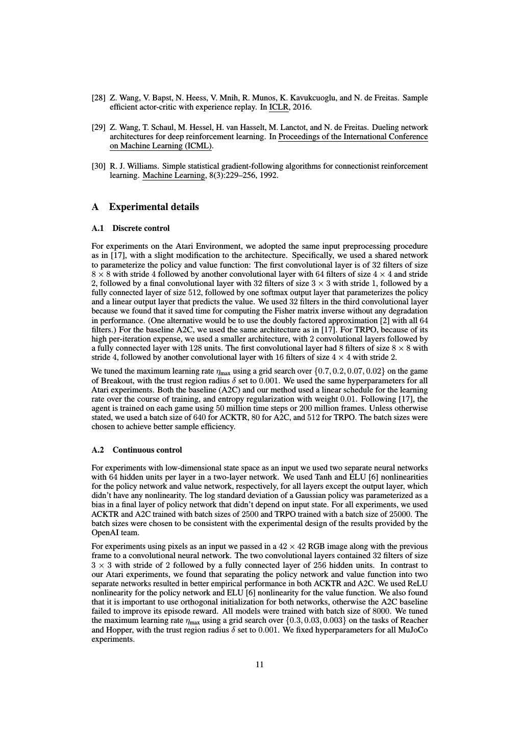 11 .[28] Z. Wang, V. Bapst, N. Heess, V. Mnih, R. Munos, K. Kavukcuoglu, and N. de Freitas. Sample efficient actor-critic with experience replay. In ICLR, 2016. [29] Z. Wang, T. Schaul, M. Hessel, H. van Hasselt, M. Lanctot, and N. de Freitas. Dueling network architectures for deep reinforcement learning. In Proceedings of the International Conference on Machine Learning (ICML). [30] R. J. Williams. Simple statistical gradient-following algorithms for connectionist reinforcement learning. Machine Learning, 8(3):229–256, 1992. A Experimental details A.1 Discrete control For experiments on the Atari Environment, we adopted the same input preprocessing procedure as in [17], with a slight modification to the architecture. Specifically, we used a shared network to parameterize the policy and value function: The first convolutional layer is of 32 filters of size 8 × 8 with stride 4 followed by another convolutional layer with 64 filters of size 4 × 4 and stride 2, followed by a final convolutional layer with 32 filters of size 3 × 3 with stride 1, followed by a fully connected layer of size 512, followed by one softmax output layer that parameterizes the policy and a linear output layer that predicts the value. We used 32 filters in the third convolutional layer because we found that it saved time for computing the Fisher matrix inverse without any degradation in performance. (One alternative would be to use the doubly factored approximation [2] with all 64 filters.) For the baseline A2C, we used the same architecture as in [17]. For TRPO, because of its high per-iteration expense, we used a smaller architecture, with 2 convolutional layers followed by a fully connected layer with 128 units. The first convolutional layer had 8 filters of size 8 × 8 with stride 4, followed by another convolutional layer with 16 filters of size 4 × 4 with stride 2. We tuned the maximum learning rate ηmax using a grid search over {0.7, 0.2, 0.07, 0.02} on the game of Breakout, with the trust region radius δ set to 0.001. We used the same hyperparameters for all Atari experiments. Both the baseline (A2C) and our method used a linear schedule for the learning rate over the course of training, and entropy regularization with weight 0.01. Following [17], the agent is trained on each game using 50 million time steps or 200 million frames. Unless otherwise stated, we used a batch size of 640 for ACKTR, 80 for A2C, and 512 for TRPO. The batch sizes were chosen to achieve better sample efficiency. A.2 Continuous control For experiments with low-dimensional state space as an input we used two separate neural networks with 64 hidden units per layer in a two-layer network. We used Tanh and ELU [6] nonlinearities for the policy network and value network, respectively, for all layers except the output layer, which didn’t have any nonlinearity. The log standard deviation of a Gaussian policy was parameterized as a bias in a final layer of policy network that didn’t depend on input state. For all experiments, we used ACKTR and A2C trained with batch sizes of 2500 and TRPO trained with a batch size of 25000. The batch sizes were chosen to be consistent with the experimental design of the results provided by the OpenAI team. For experiments using pixels as an input we passed in a 42 × 42 RGB image along with the previous frame to a convolutional neural network. The two convolutional layers contained 32 filters of size 3 × 3 with stride of 2 followed by a fully connected layer of 256 hidden units. In contrast to our Atari experiments, we found that separating the policy network and value function into two separate networks resulted in better empirical performance in both ACKTR and A2C. We used ReLU nonlinearity for the policy network and ELU [6] nonlinearity for the value function. We also found that it is important to use orthogonal initialization for both networks, otherwise the A2C baseline failed to improve its episode reward. All models were trained with batch size of 8000. We tuned the maximum learning rate ηmax using a grid search over {0.3, 0.03, 0.003} on the tasks of Reacher and Hopper, with the trust region radius δ set to 0.001. We fixed hyperparameters for all MuJoCo experiments. 11
