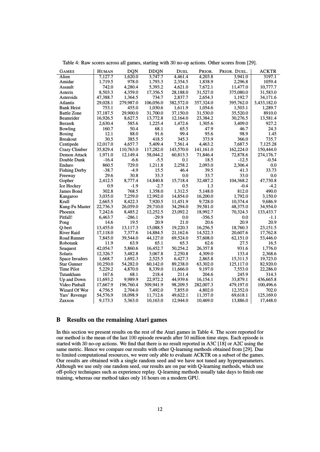 12 . Table 4: Raw scores across all games, starting with 30 no-op actions. Other scores from [29]. G AMES H UMAN DQN DDQN D UEL P RIOR . P RIOR . D UEL . ACKTR Alien 7,127.7 1,620.0 3,747.7 4,461.4 4,203.8 3,941.0 3197.1 Amidar 1,719.5 978.0 1,793.3 2,354.5 1,838.9 2,296.8 1059.4 Assault 742.0 4,280.4 5,393.2 4,621.0 7,672.1 11,477.0 10,777.7 Asterix 8,503.3 4,359.0 17,356.5 28,188.0 31,527.0 375,080.0 31,583.0 Asteroids 47,388.7 1,364.5 734.7 2,837.7 2,654.3 1,192.7 34,171.6 Atlantis 29,028.1 279,987.0 106,056.0 382,572.0 357,324.0 395,762.0 3,433,182.0 Bank Heist 753.1 455.0 1,030.6 1,611.9 1,054.6 1,503.1 1,289.7 Battle Zone 37,187.5 29,900.0 31,700.0 37,150.0 31,530.0 35,520.0 8910.0 Beamrider 16,926.5 8,627.5 13,772.8 12,164.0 23,384.2 30,276.5 13,581.4 Berzerk 2,630.4 585.6 1,225.4 1,472.6 1,305.6 3,409.0 927.2 Bowling 160.7 50.4 68.1 65.5 47.9 46.7 24.3 Boxing 12.1 88.0 91.6 99.4 95.6 98.9 1.45 Breakout 30.5 385.5 418.5 345.3 373.9 366.0 735.7 Centipede 12,017.0 4,657.7 5,409.4 7,561.4 4,463.2 7,687.5 7,125.28 Crazy Climber 35,829.4 110,763.0 117,282.0 143,570.0 141,161.0 162,224.0 150,444.0 Demon Attack 1,971.0 12,149.4 58,044.2 60,813.3 71,846.4 72,878.6 274,176.7 Double Dunk -16.4 -6.6 -5.5 0.1 18.5 -12.5 -0.54 Enduro 860.5 729.0 1,211.8 2,258.2 2,093.0 2,306.4 0.0 Fishing Derby -38.7 -4.9 15.5 46.4 39.5 41.3 33.73 Freeway 29.6 30.8 33.3 0.0 33.7 33.0 0.0 Gopher 2,412.5 8,777.4 14,840.8 15,718.4 32,487.2 104,368.2 47,730.8 Ice Hockey 0.9 -1.9 -2.7 0.5 1.3 -0.4 -4.2 James Bond 302.8 768.5 1,358.0 1,312.5 5,148.0 812.0 490.0 Kangaroo 3,035.0 7,259.0 12,992.0 14,854.0 16,200.0 1,792.0 3,150.0 Krull 2,665.5 8,422.3 7,920.5 11,451.9 9,728.0 10,374.4 9,686.9 Kung-Fu Master 22,736.3 26,059.0 29,710.0 34,294.0 39,581.0 48,375.0 34,954.0 Phoenix 7,242.6 8,485.2 12,252.5 23,092.2 18,992.7 70,324.3 133,433.7 Pitfall! 6,463.7 -286.1 -29.9 0.0 -356.5 0.0 -1.1 Pong 14.6 19.5 20.9 21.0 20.6 20.9 20.9 Q-bert 13,455.0 13,117.3 15,088.5 19,220.3 16,256.5 18,760.3 23,151.5 River Raid 17,118.0 7,377.6 14,884.5 21,162.6 14,522.3 20,607.6 17,762.8 Road Runner 7,845.0 39,544.0 44,127.0 69,524.0 57,608.0 62,151.0 53,446.0 Robotank 11.9 63.9 65.1 65.3 62.6 27.5 16.5 Seaquest 42,054.7 5,860.6 16,452.7 50,254.2 26,357.8 931.6 1,776.0 Solaris 12,326.7 3,482.8 3,067.8 2,250.8 4,309.0 133.4 2,368.6 Space Invaders 1,668.7 1,692.3 2,525.5 6,427.3 2,865.8 15,311.5 19,723.0 Star Gunner 10,250.0 54,282.0 60,142.0 89,238.0 63,302.0 125,117.0 82,920.0 Time Pilot 5,229.2 4,870.0 8,339.0 11,666.0 9,197.0 7,553.0 22,286.0 Tutankham 167.6 68.1 218.4 211.4 204.6 245.9 314.3 Up and Down 11,693.2 9,989.9 22,972.2 44,939.6 16,154.1 33,879.1 436,665.8 Video Pinball 17,667.9 196,760.4 309,941.9 98,209.5 282,007.3 479,197.0 100,496.6 Wizard Of Wor 4,756.5 2,704.0 7,492.0 7,855.0 4,802.0 12,352.0 702.0 Yars’ Revenge 54,576.9 18,098.9 11,712.6 49,622.1 11,357.0 69,618.1 125,169.0 Zaxxon 9,173.3 5,363.0 10,163.0 12,944.0 10,469.0 13,886.0 17,448.0 B Results on the remaining Atari games In this section we present results on the rest of the Atari games in Table 4. The score reported for our method is the mean of the last 100 episode rewards after 50 million time steps. Each episode is started with 30 no-op actions. We find that there is no result reported in A3C [18] or A2C using the same metric. Hence we compare our results with other Q-learning methods obtained from [29]. Due to limited computational resources, we were only able to evaluate ACKTR on a subset of the games. Our results are obtained with a single random seed and we have not tuned any hyperparameters. Although we use only one random seed, our results are on par with Q-learning methods, which use off-policy techniques such as experience replay. Q-learning methods usually take days to finish one training, whereas our method takes only 16 hours on a modern GPU. 12
