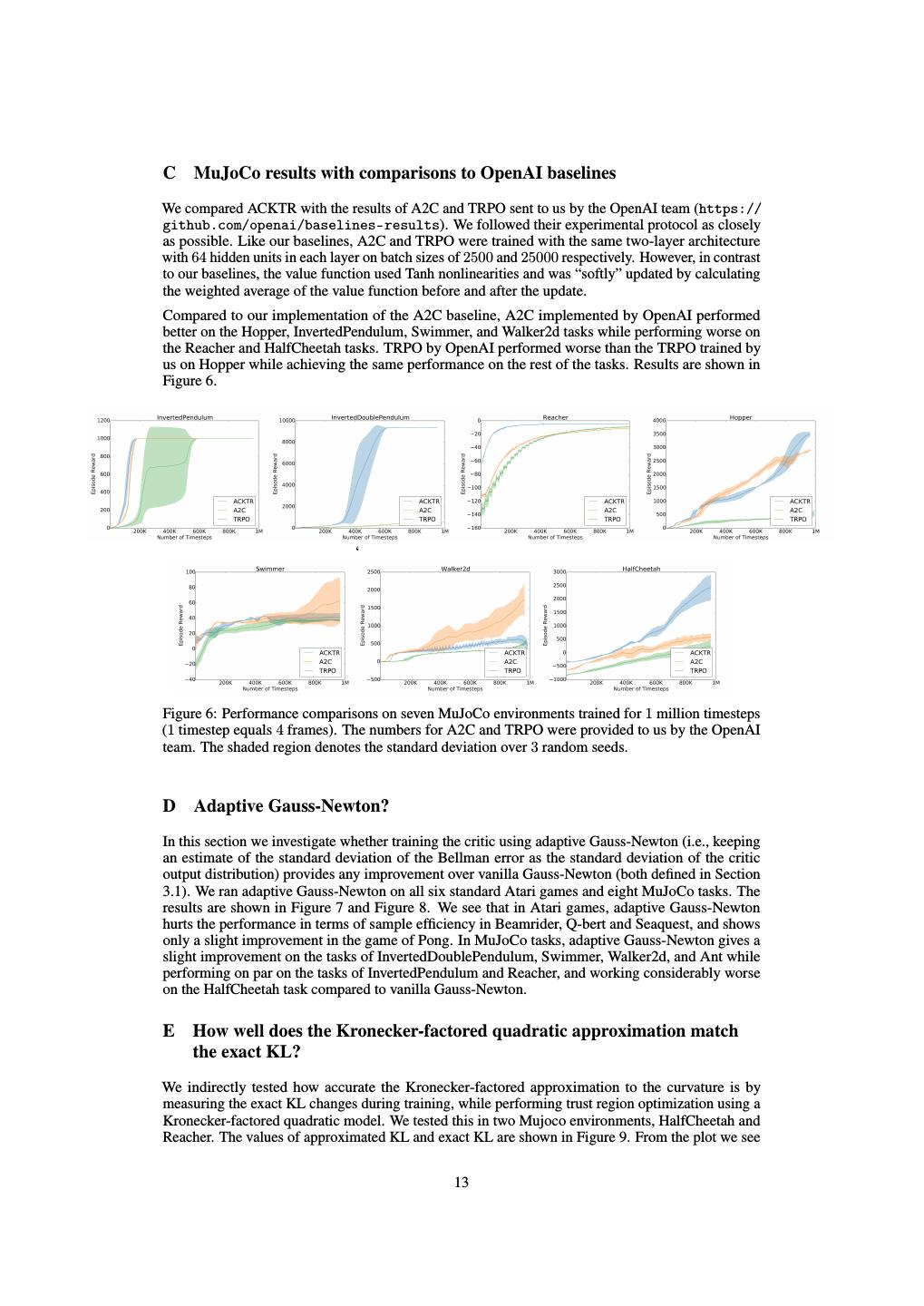 13 .C MuJoCo results with comparisons to OpenAI baselines We compared ACKTR with the results of A2C and TRPO sent to us by the OpenAI team (https:// github.com/openai/baselines-results). We followed their experimental protocol as closely as possible. Like our baselines, A2C and TRPO were trained with the same two-layer architecture with 64 hidden units in each layer on batch sizes of 2500 and 25000 respectively. However, in contrast to our baselines, the value function used Tanh nonlinearities and was “softly” updated by calculating the weighted average of the value function before and after the update. Compared to our implementation of the A2C baseline, A2C implemented by OpenAI performed better on the Hopper, InvertedPendulum, Swimmer, and Walker2d tasks while performing worse on the Reacher and HalfCheetah tasks. TRPO by OpenAI performed worse than the TRPO trained by us on Hopper while achieving the same performance on the rest of the tasks. Results are shown in Figure 6. ‘ Figure 6: Performance comparisons on seven MuJoCo environments trained for 1 million timesteps (1 timestep equals 4 frames). The numbers for A2C and TRPO were provided to us by the OpenAI team. The shaded region denotes the standard deviation over 3 random seeds. D Adaptive Gauss-Newton? In this section we investigate whether training the critic using adaptive Gauss-Newton (i.e., keeping an estimate of the standard deviation of the Bellman error as the standard deviation of the critic output distribution) provides any improvement over vanilla Gauss-Newton (both defined in Section 3.1). We ran adaptive Gauss-Newton on all six standard Atari games and eight MuJoCo tasks. The results are shown in Figure 7 and Figure 8. We see that in Atari games, adaptive Gauss-Newton hurts the performance in terms of sample efficiency in Beamrider, Q-bert and Seaquest, and shows only a slight improvement in the game of Pong. In MuJoCo tasks, adaptive Gauss-Newton gives a slight improvement on the tasks of InvertedDoublePendulum, Swimmer, Walker2d, and Ant while performing on par on the tasks of InvertedPendulum and Reacher, and working considerably worse on the HalfCheetah task compared to vanilla Gauss-Newton. E How well does the Kronecker-factored quadratic approximation match the exact KL? We indirectly tested how accurate the Kronecker-factored approximation to the curvature is by measuring the exact KL changes during training, while performing trust region optimization using a Kronecker-factored quadratic model. We tested this in two Mujoco environments, HalfCheetah and Reacher. The values of approximated KL and exact KL are shown in Figure 9. From the plot we see 13