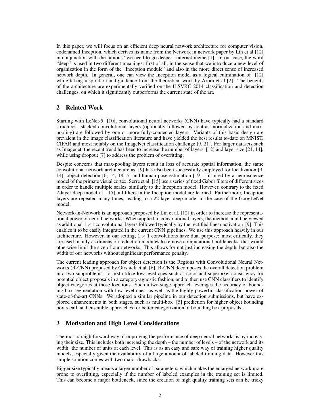 2 .In this paper, we will focus on an efficient deep neural network architecture for computer vision, codenamed Inception, which derives its name from the Network in network paper by Lin et al [12] in conjunction with the famous “we need to go deeper” internet meme [1]. In our case, the word “deep” is used in two different meanings: first of all, in the sense that we introduce a new level of organization in the form of the “Inception module” and also in the more direct sense of increased network depth. In general, one can view the Inception model as a logical culmination of [12] while taking inspiration and guidance from the theoretical work by Arora et al [2]. The benefits of the architecture are experimentally verified on the ILSVRC 2014 classification and detection challenges, on which it significantly outperforms the current state of the art. 2 Related Work Starting with LeNet-5 [10], convolutional neural networks (CNN) have typically had a standard structure – stacked convolutional layers (optionally followed by contrast normalization and max- pooling) are followed by one or more fully-connected layers. Variants of this basic design are prevalent in the image classification literature and have yielded the best results to-date on MNIST, CIFAR and most notably on the ImageNet classification challenge [9, 21]. For larger datasets such as Imagenet, the recent trend has been to increase the number of layers [12] and layer size [21, 14], while using dropout [7] to address the problem of overfitting. Despite concerns that max-pooling layers result in loss of accurate spatial information, the same convolutional network architecture as [9] has also been successfully employed for localization [9, 14], object detection [6, 14, 18, 5] and human pose estimation [19]. Inspired by a neuroscience model of the primate visual cortex, Serre et al. [15] use a series of fixed Gabor filters of different sizes in order to handle multiple scales, similarly to the Inception model. However, contrary to the fixed 2-layer deep model of [15], all filters in the Inception model are learned. Furthermore, Inception layers are repeated many times, leading to a 22-layer deep model in the case of the GoogLeNet model. Network-in-Network is an approach proposed by Lin et al. [12] in order to increase the representa- tional power of neural networks. When applied to convolutional layers, the method could be viewed as additional 1 × 1 convolutional layers followed typically by the rectified linear activation [9]. This enables it to be easily integrated in the current CNN pipelines. We use this approach heavily in our architecture. However, in our setting, 1 × 1 convolutions have dual purpose: most critically, they are used mainly as dimension reduction modules to remove computational bottlenecks, that would otherwise limit the size of our networks. This allows for not just increasing the depth, but also the width of our networks without significant performance penalty. The current leading approach for object detection is the Regions with Convolutional Neural Net- works (R-CNN) proposed by Girshick et al. [6]. R-CNN decomposes the overall detection problem into two subproblems: to first utilize low-level cues such as color and superpixel consistency for potential object proposals in a category-agnostic fashion, and to then use CNN classifiers to identify object categories at those locations. Such a two stage approach leverages the accuracy of bound- ing box segmentation with low-level cues, as well as the highly powerful classification power of state-of-the-art CNNs. We adopted a similar pipeline in our detection submissions, but have ex- plored enhancements in both stages, such as multi-box [5] prediction for higher object bounding box recall, and ensemble approaches for better categorization of bounding box proposals. 3 Motivation and High Level Considerations The most straightforward way of improving the performance of deep neural networks is by increas- ing their size. This includes both increasing the depth – the number of levels – of the network and its width: the number of units at each level. This is as an easy and safe way of training higher quality models, especially given the availability of a large amount of labeled training data. However this simple solution comes with two major drawbacks. Bigger size typically means a larger number of parameters, which makes the enlarged network more prone to overfitting, especially if the number of labeled examples in the training set is limited. This can become a major bottleneck, since the creation of high quality training sets can be tricky 2