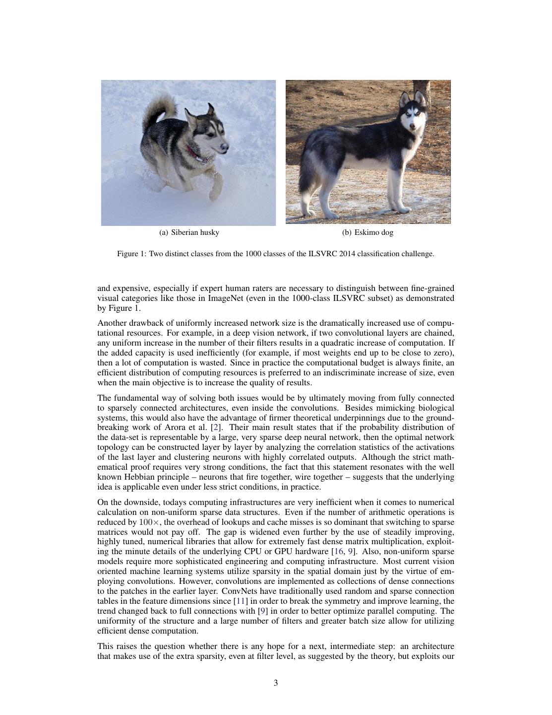 3 . (a) Siberian husky (b) Eskimo dog Figure 1: Two distinct classes from the 1000 classes of the ILSVRC 2014 classification challenge. and expensive, especially if expert human raters are necessary to distinguish between fine-grained visual categories like those in ImageNet (even in the 1000-class ILSVRC subset) as demonstrated by Figure 1. Another drawback of uniformly increased network size is the dramatically increased use of compu- tational resources. For example, in a deep vision network, if two convolutional layers are chained, any uniform increase in the number of their filters results in a quadratic increase of computation. If the added capacity is used inefficiently (for example, if most weights end up to be close to zero), then a lot of computation is wasted. Since in practice the computational budget is always finite, an efficient distribution of computing resources is preferred to an indiscriminate increase of size, even when the main objective is to increase the quality of results. The fundamental way of solving both issues would be by ultimately moving from fully connected to sparsely connected architectures, even inside the convolutions. Besides mimicking biological systems, this would also have the advantage of firmer theoretical underpinnings due to the ground- breaking work of Arora et al. [2]. Their main result states that if the probability distribution of the data-set is representable by a large, very sparse deep neural network, then the optimal network topology can be constructed layer by layer by analyzing the correlation statistics of the activations of the last layer and clustering neurons with highly correlated outputs. Although the strict math- ematical proof requires very strong conditions, the fact that this statement resonates with the well known Hebbian principle – neurons that fire together, wire together – suggests that the underlying idea is applicable even under less strict conditions, in practice. On the downside, todays computing infrastructures are very inefficient when it comes to numerical calculation on non-uniform sparse data structures. Even if the number of arithmetic operations is reduced by 100×, the overhead of lookups and cache misses is so dominant that switching to sparse matrices would not pay off. The gap is widened even further by the use of steadily improving, highly tuned, numerical libraries that allow for extremely fast dense matrix multiplication, exploit- ing the minute details of the underlying CPU or GPU hardware [16, 9]. Also, non-uniform sparse models require more sophisticated engineering and computing infrastructure. Most current vision oriented machine learning systems utilize sparsity in the spatial domain just by the virtue of em- ploying convolutions. However, convolutions are implemented as collections of dense connections to the patches in the earlier layer. ConvNets have traditionally used random and sparse connection tables in the feature dimensions since [11] in order to break the symmetry and improve learning, the trend changed back to full connections with [9] in order to better optimize parallel computing. The uniformity of the structure and a large number of filters and greater batch size allow for utilizing efficient dense computation. This raises the question whether there is any hope for a next, intermediate step: an architecture that makes use of the extra sparsity, even at filter level, as suggested by the theory, but exploits our 3